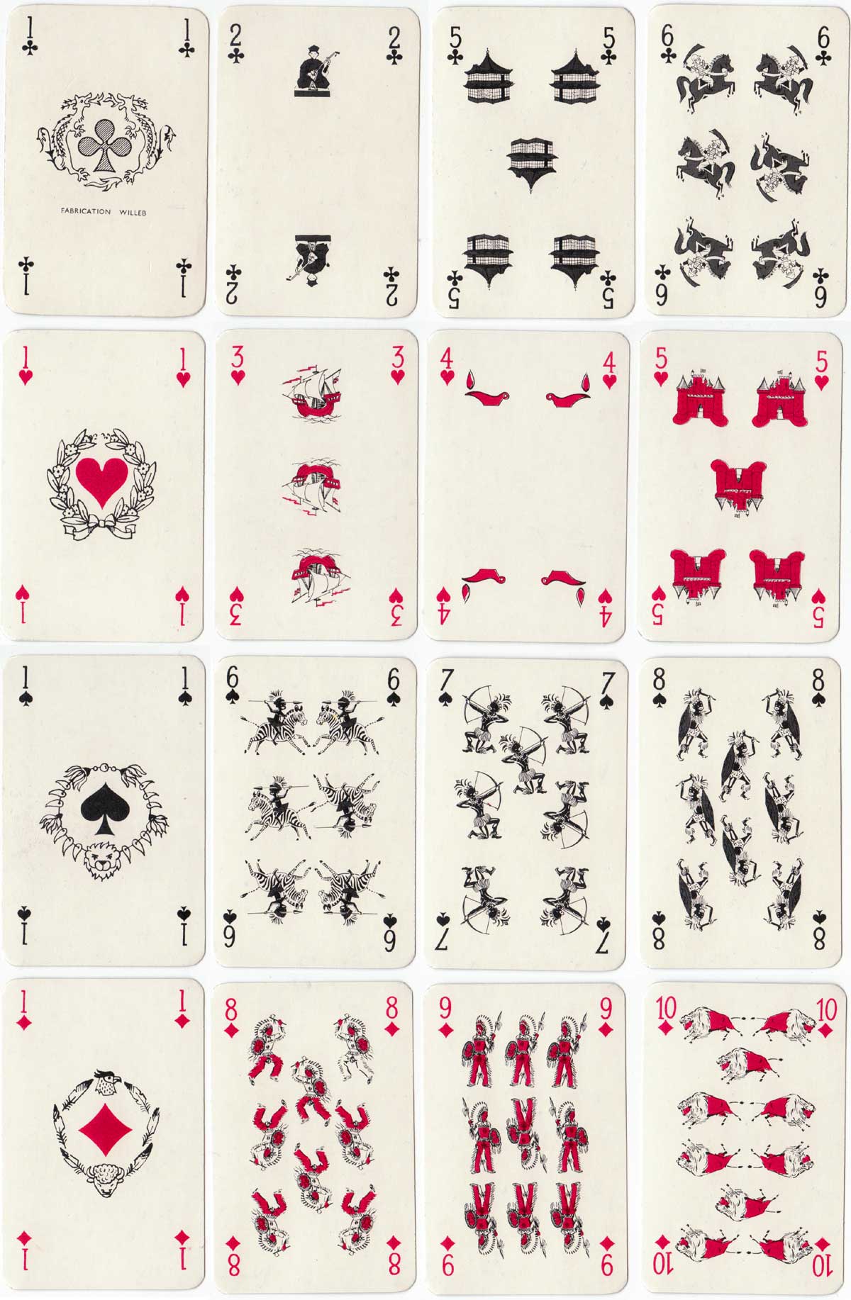 Jeu de Bataille card game published by Éditions Willeb, Paris, whose name appears on the ace of clubs. The non-standard court cards and numeral pips represent characters from different nationalities or ethnic groups who are presumably engaged in battle. These are : medieval European, native African, American Indian and Japanese. The cards are designed in the style of the French standard pattern with diagonal dividing lines between each end. Éditions Willeb, 13 Rue Marivaux, Paris, were book publishers since 1930s also published standard cards, tarots, children's card games, toys and puzzles.