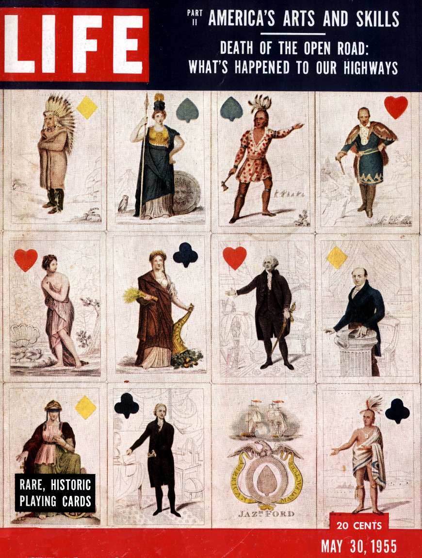 The front cover of Life Magazine, May 30, 1955, featured a colour photo of Historic Playing Cards commemorating early U.S. events and heroes whilst the accompanying article inside the magazine displayed the masterpieces of colonial designers who created native styles as statesmen were building a new nation... Long before 1776 the independence of America was being declared by its arts and manufactures.. silverware, guns, furniture, houses & playing cards... The court cards shown are in fact from the Seminole Wars deck by J. Y. Humphreys, Philadelphia, c.1819, whilst the Ace of Spades is from Jazaniah Ford's Decatur deck, 1815.