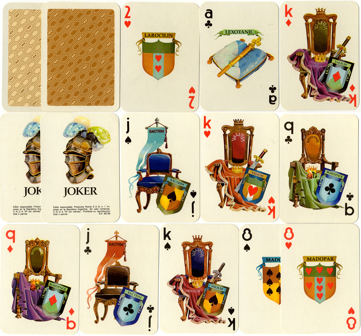 Special non-standard promotional playing cards for Productos Roche S.A.Q. e I. (Argentina). The kings, queens and jacks are represented by vacant thrones and the name of a pharmaceutical drug appears in a shield or banderole on each card. Designed by Graficar S.A. and printed by Impresores S.C.A. See also: Naipes Minifusor►