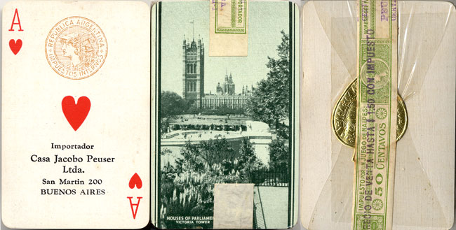 Above: pack featuring the "Houses of Parliament / Victoria Tower" (London) manufactured in England by John Waddington, imported into Argentina by Casa Jacobo Peuser Ltda, c.1938. The importer's details "Peuser Ltda" are overprinted on the ace of hearts and at the right-hand end of the 50 Centavos green tax band fixed around the sealed pack (Decreto No.11,252, 1924-1943). Several others including 'Beautiful Britain' packs with iconic views of London, such as "Tower & Tower Bridge" are also known to have been imported by Jacobo Peuser.