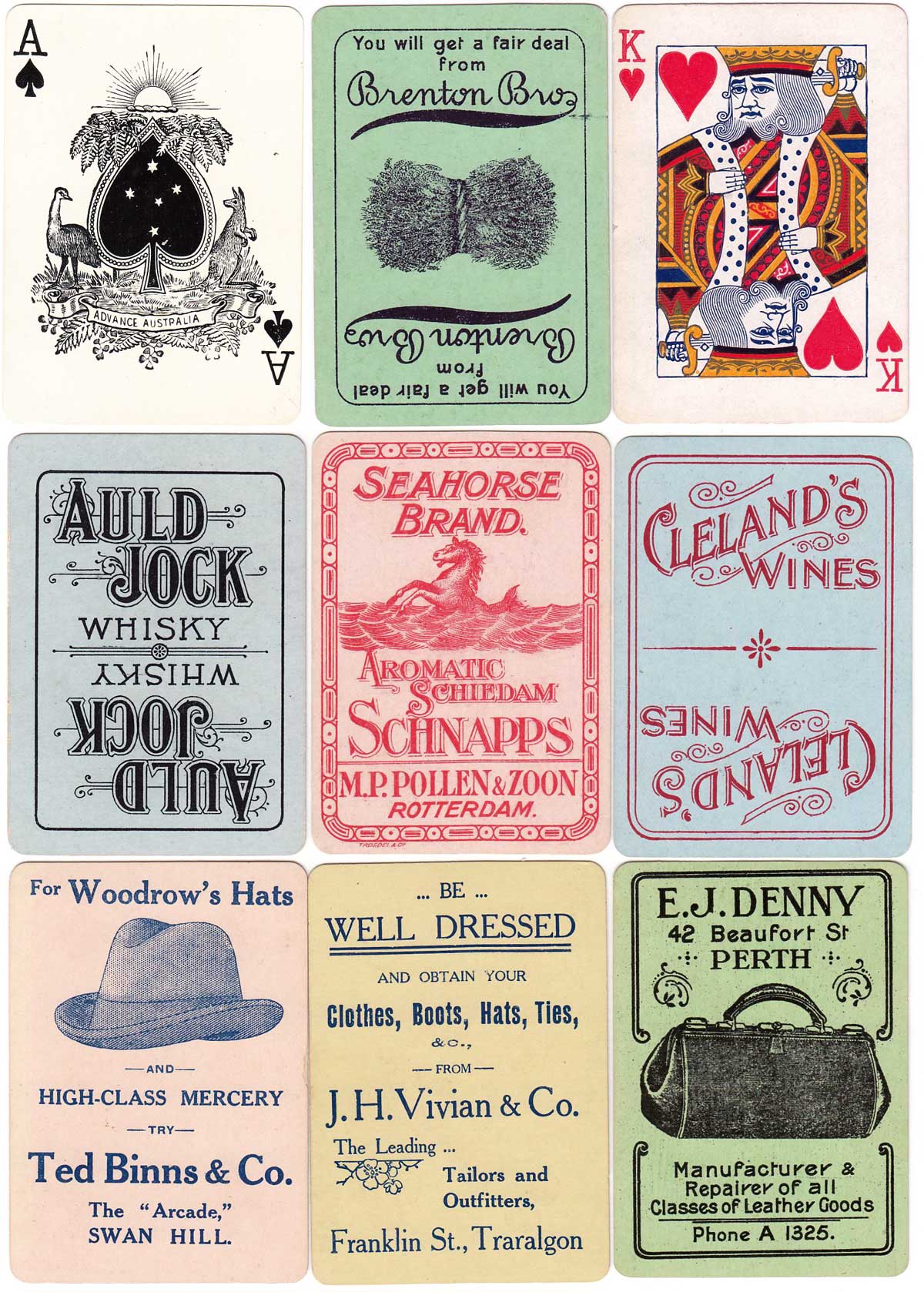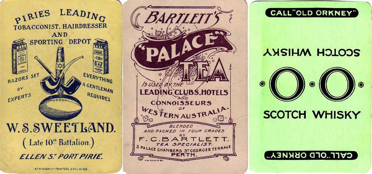 William Detmold kept boards with the faces printed ready for printing special designs or advertisements on the backs. Some of these would have been printed by other people such as Troedel & Co (Seahorse Schnapps), F.W. Niven & Co (Bartlett’s tea) and Atkinson & Co (Sweetland’s), as they’d have acquired the blank backed cards from Thomas/Detmold and then printed their own ads onto them. Two or four colour courts were used, depending on the budget.