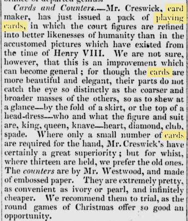 The redrawn version of the standard courts, which seems to fit with these other two packs, is referred to in a review in the Journal of Belles Lettres from 1827 (though this could refer to either of the non-standard packs, too):