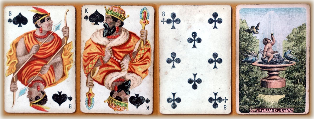 Wüst prepared cards with the King as a portrait of Caspar Wüst; the Queen as Mathilda Wüst and the Jack, Mathilda’s husband Hermann. In Germany the game of Skat resulted in intense competition between playing card manufacturers. Wüst countered with a unique double figure pack of cards split in the diagonal, the first Wüst standard pattern.