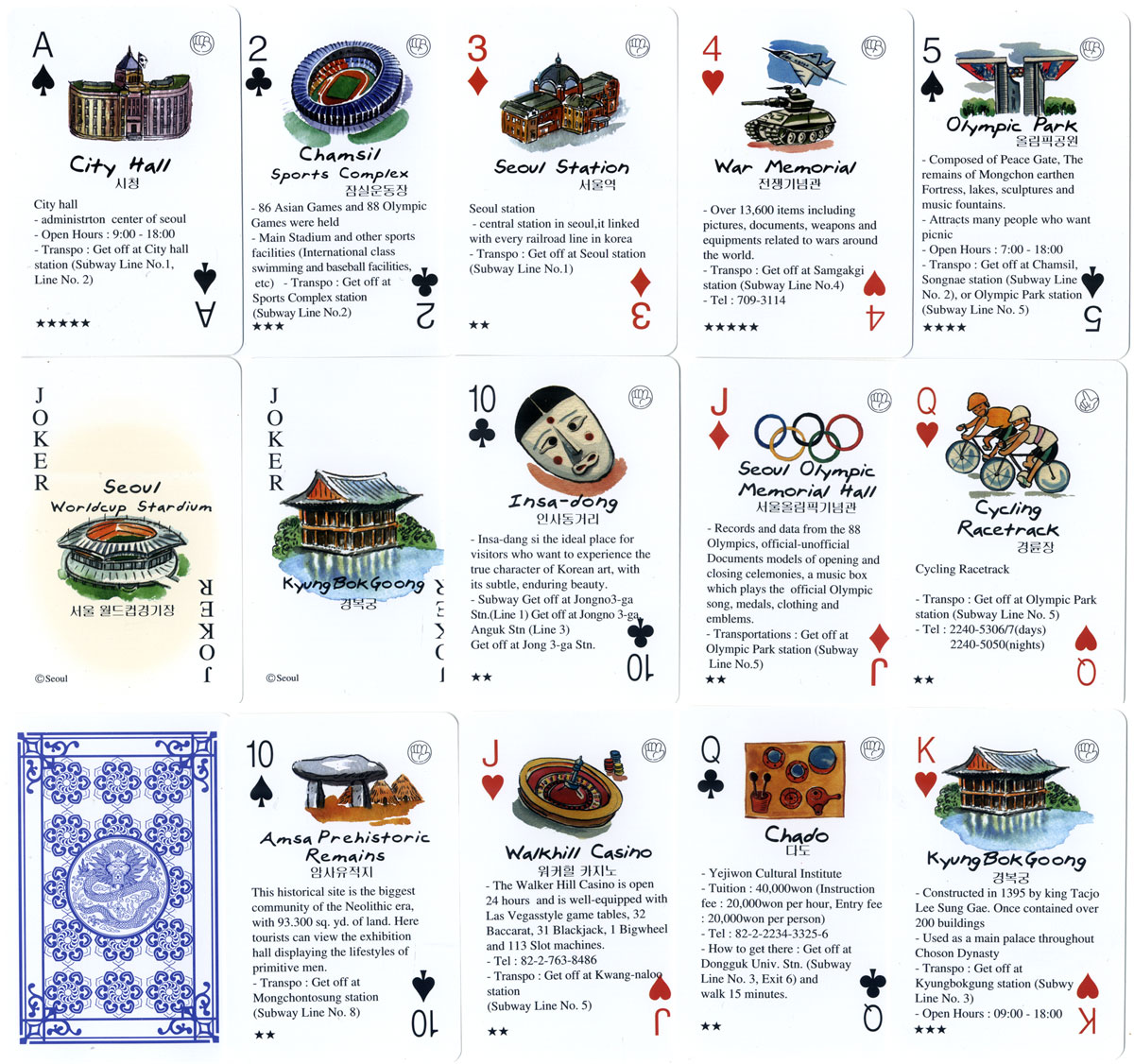 In these ‘Souvenir of Korea’ playing cards each card has a colour drawing of a Korean building, museum or cultural attraction with the title in handwritten letters and Korean printed script, and a brief description and details of how to get there printed beneath in dodgy English. There is also some kind of star rating system shown on each card. The two Jokers repeat two of the images from the cards. The Internet address printed on the box [www.folkartkorea.com] appears to be defunct.