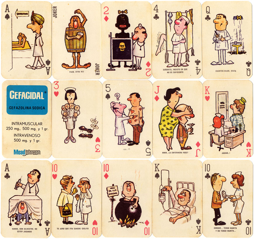 Above: “Cefacidal” advertising playing cards, Peru c.1975. Each card contains a cartoon depicting medical humour, with standard playing card indices in the corners. 52 cards + 2 Jokers in box.