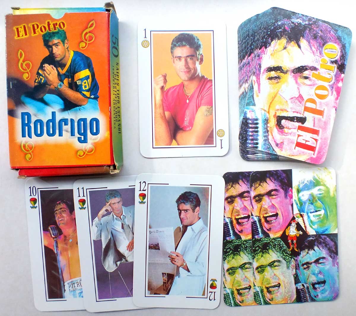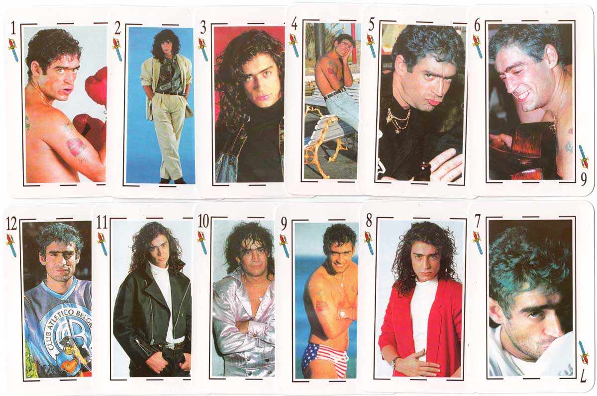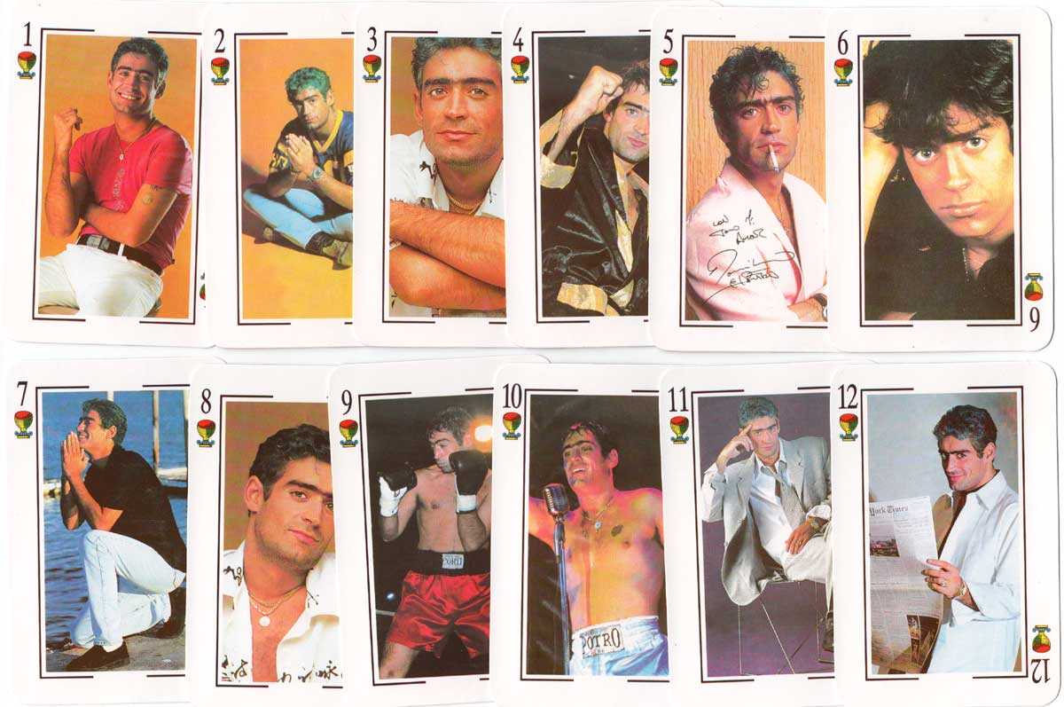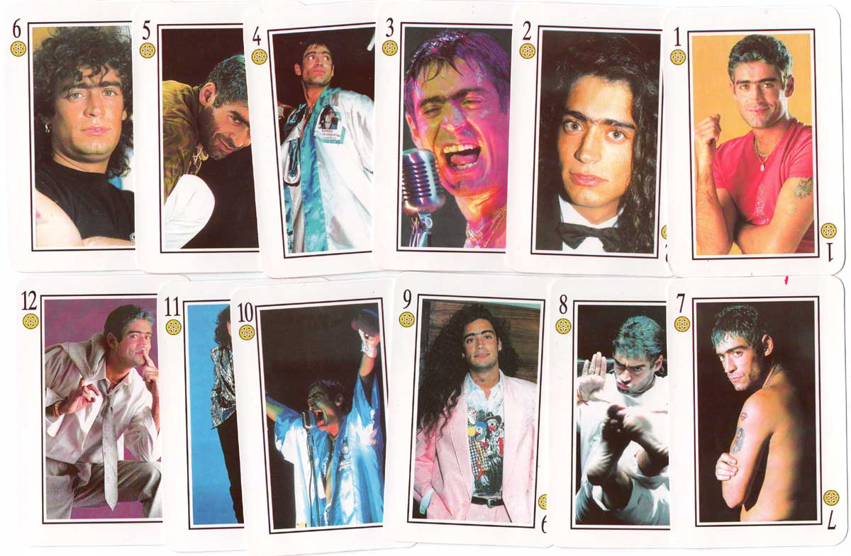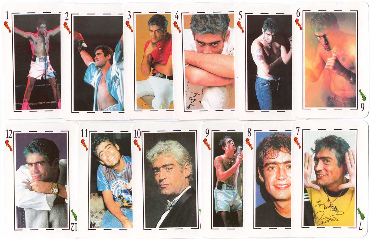 Above: Naipes El Potro Rodrigo with Spanish suit symbols and photos of the pop singer on each card, by John Sterling / Distigráfica S.R.L., c.2000. 48 cards + 2 jokers in box.