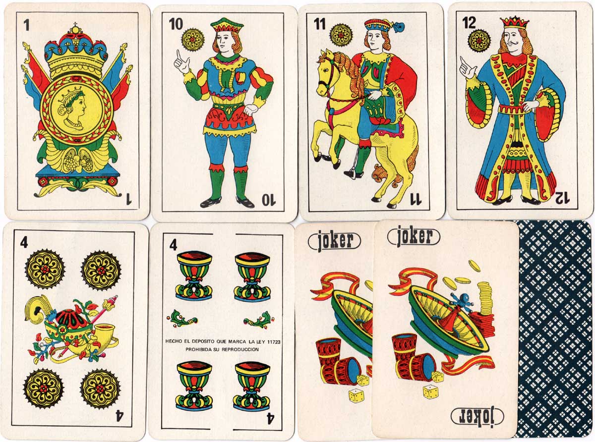 Above: “Felicidades” naipes Español, c.1973. 48 cards + 2 jokers. The same ace of coins and court designs are used as in the “Punto y Banca” decks shown above, including the roulette wheel jokers, but the four of coins features a different motif and the four of cups has extra decorations. The box states "Pro Graf Industria Argentina".