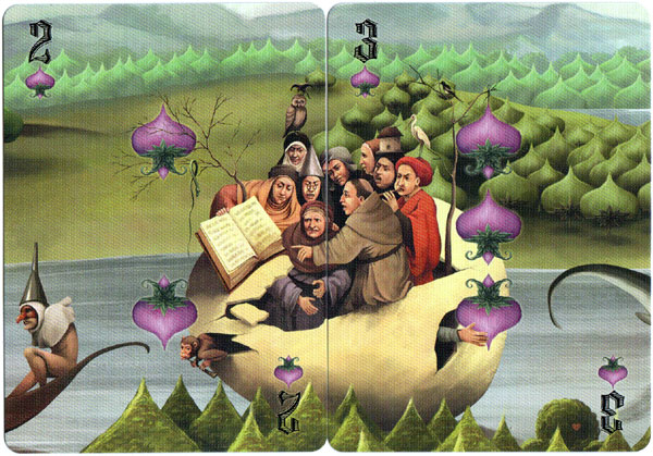 Above: selected cards showing scenes from Sunish Chabba’s Bosch Puzzle Transformed Playing Cards, Collector’s Edition, published by Guru Playing Card Co., Vic 3132, Australia, 2020. Printed in Taiwan by Legends Playing Card Co. 55 Poker sized cards (3.5" X 2.5") in tuck box. Miniature version also available.