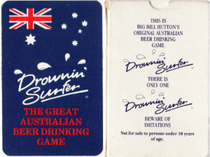 “Drownin’ Surfer” the great Australian beer drinking card game devised by Bill Hutton guaranteed to sort out the blokes from the sheilas... One of the objectives of the game is not to get left with the “Big Black Croc” card when someone goes out ’cause that’s big worries. The spirit of the game can be learnt by reading the rules→