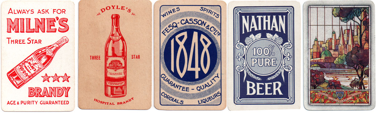 Above: assorted back designs by Spicer & Detmold Ltd. An interesting series they produced in the 1930s was for Tintara. The deck also has special aces. The backs came in at least 2 colour versions each, at least one had 4 different coloured backs. It was a boom time for drinks adverts on cards in the 1930s.