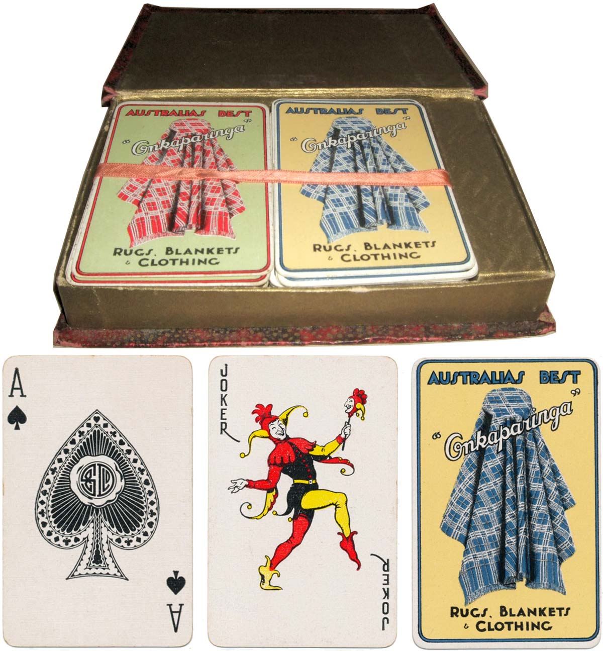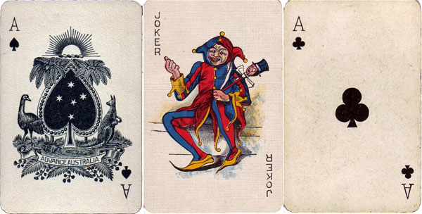 Above: until 1932, the ace of spades and seated Joker were used, carried over from the Detmold / W. Thomas era, with the word “Joker” in the corners instead of the little jester’s head. The number card clubs are printed rather ‘thickly’.