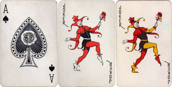 Above: after 1932 a new ace of spades and joker were introduced. We can’t say for sure why they changed; maybe the introduction of playing card tax got them to do a design rethink, after all the coat of arms ace was a bit dated by the 30s!