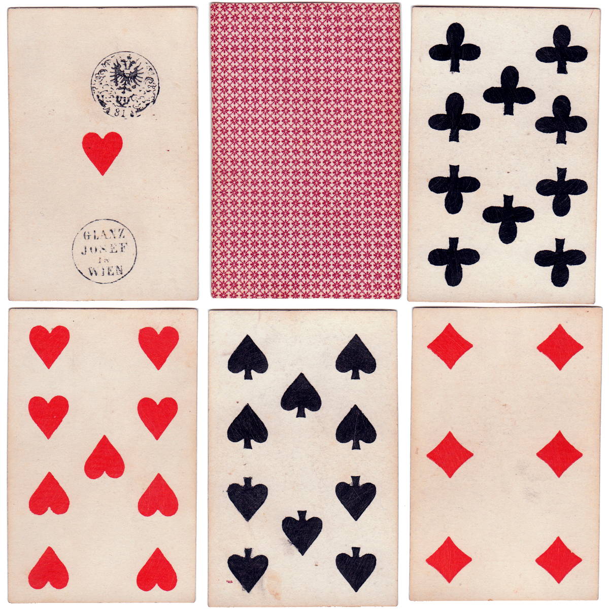 Joseph Glanz of Vienna (1849-1912) was a leading Austrian manufacturer of fine playing cards. During its lifetime the firm had acquired Max Uffenheimer and Johann Ritter & Cie but was in turn absorbed by Piatnik in 1912. These finely engraved playing cards are hand-coloured using stencils, displaying the cardmaker’s excellent craftmanship from that period. The tax stamp on the Ace of Hearts (right) was used between c.1859-1877.