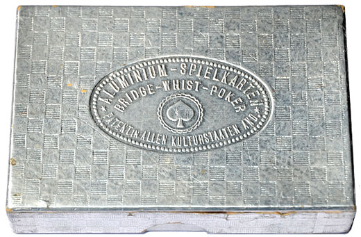 Above: aluminium playing cards manufactured by Häusermann United Chemical and Metal Engraving Co., Vienna, c.1925. The colouring on a few cards varies. Weight in box: 210gm, 52 + Joker + extra card.