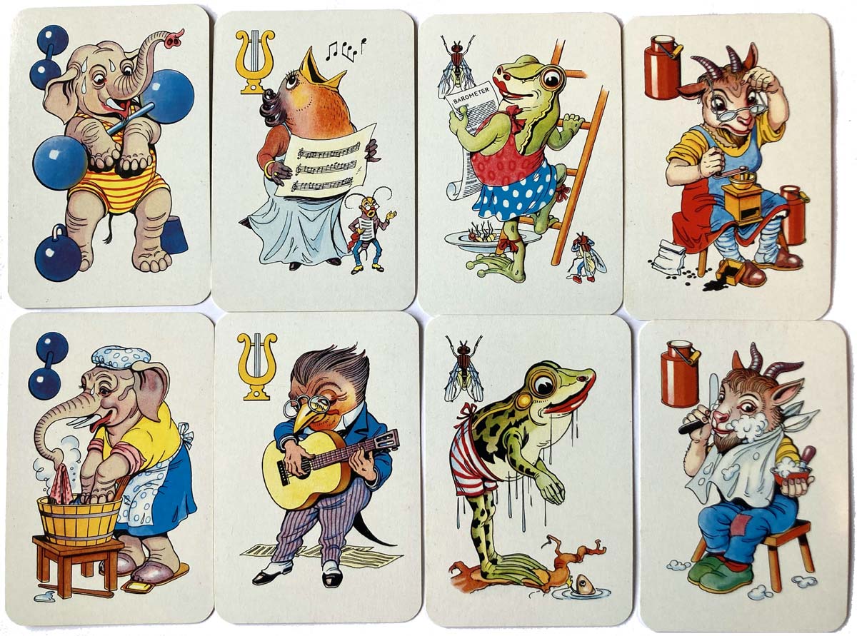 With Comic animals. In both these games the artist is Willy Mayrl, who designed for Piatnik over a long period. His name or logo usually appears somewhere in the artwork. Click the image to see the rules.