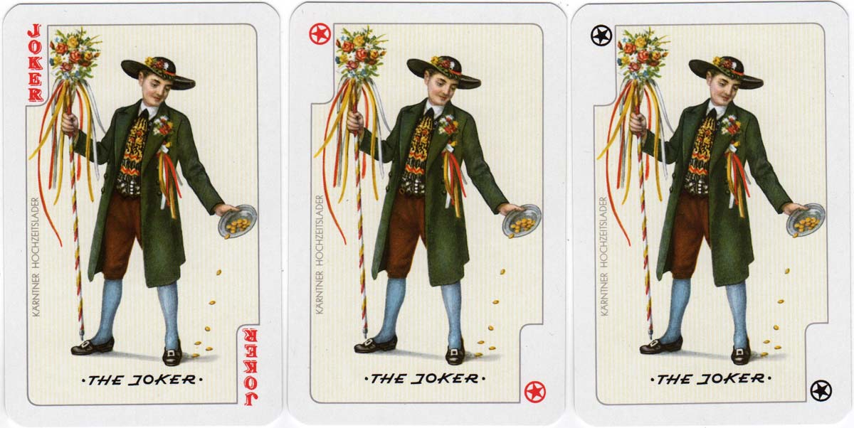 Above: Folklore No.2169 dual bridge deck by Piatnik, Vienna, 1979. The 3 jokers depict a Carinthian Wedding Inviter (Kärntner Hochzeitslader). Images courtesy Matt Probert.