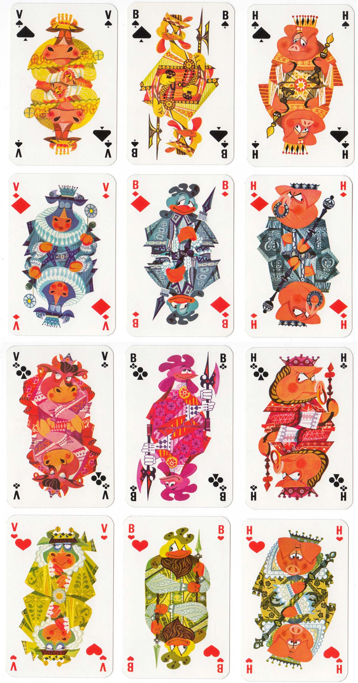 Promotional deck designed by Belgian artist Ray Goossens (1924-1998) for Boerenbond farmers’ union, c.1968. Unfortunately, the cards proved unpopular with regular players because the old familiar faces are replaced by cows, hens and pigs in cartoon form.
