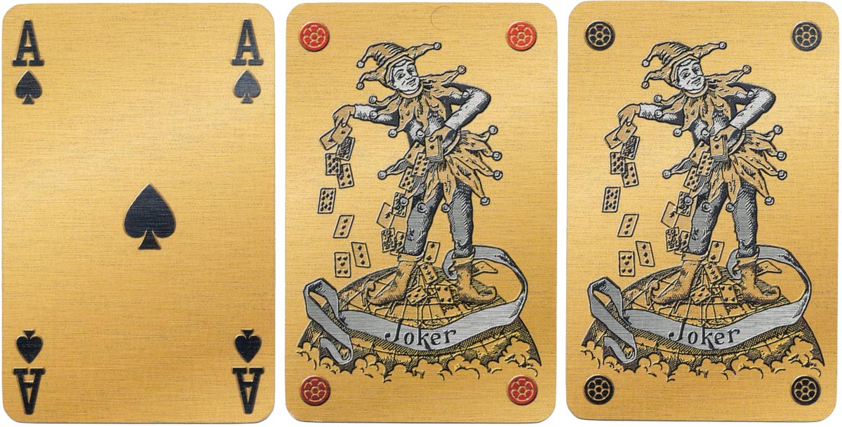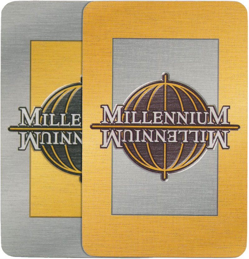 Above: ‘Millennium’ playing cards by Carta Mundi, 1999, in a limited edition of only 25,000 sets. One pack is silver-backed with gold edges, the other is gold-backed with silver edges. Both packs are Bridge-sized with four indices. The ‘Millennium’ logo seen on the backs of the cards is also featured on the luxurious metal box container. Images courtesy Matt Probert.