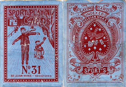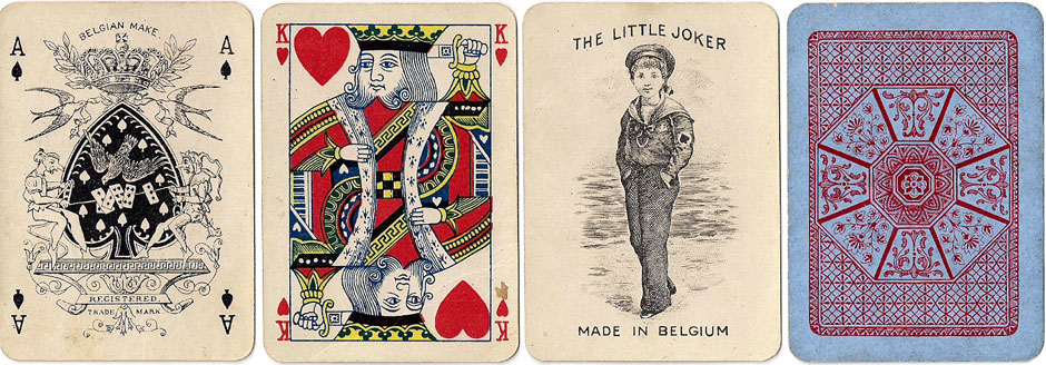 Above: 'Sport No.31' playing cards manufactured by A. van Genechten, Turnhout, Belgium, c.1910. The Ace of Spades was a registered trade mark since February 1885, and this was followed in 1888 by the Sailor Joker designed by Houssiaux of Brussels. The court cards appear to be inspired by the designs of De la Rue. Images courtesy Rod Starling.