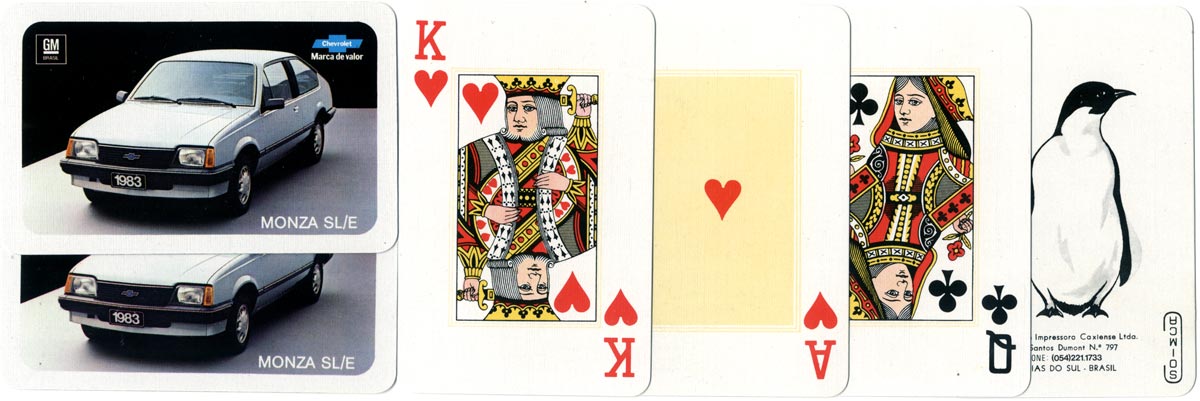 Above: Pingüim brand Anglo-American type playing cards with advertising reverse for Chevrolet / General Motors, 1983. The trade mark penguin Joker has been used, along with the internationally accepted copy of Fournier's large index Anglo-American courts.