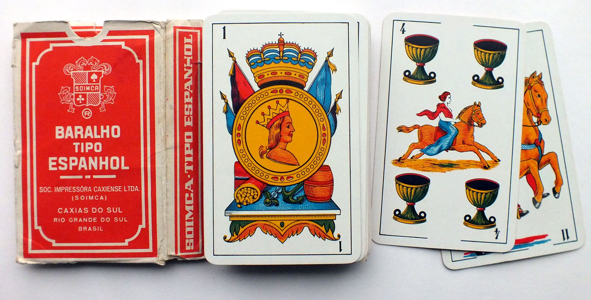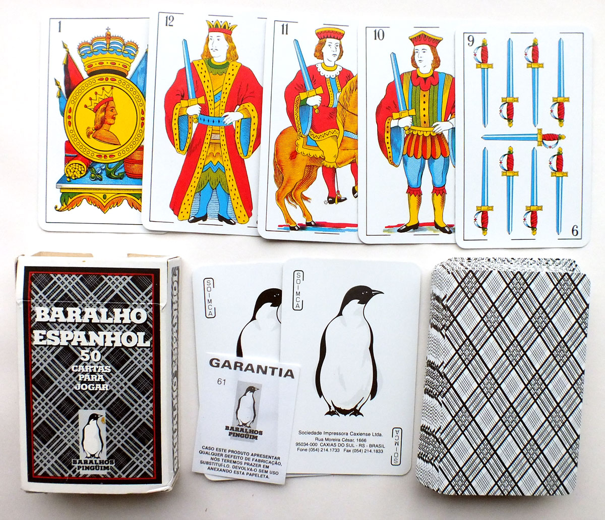 SOIMCA (Sociedade Impressora Caxiense) is an important playing card manufacturer in Brazil. It was established by Nelson Soares in Caxias do Sul, in the south of Brazil, by 1955. Its Pingüim brand is very popular. In 1993 SOIMCA asked the artist Gertre to design a new Spanish-suited pack, inspired on the Castilian pattern; they tried to introduce these into players’ circles but they were not well received. The designs were traded with COPAG and nowadays are used by COPAG as its Spanish-style cards for exportation. In 1999 SOIMCA jointed forces with COPAG, transferring its machines to Manaus.