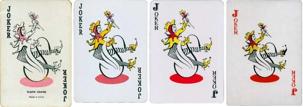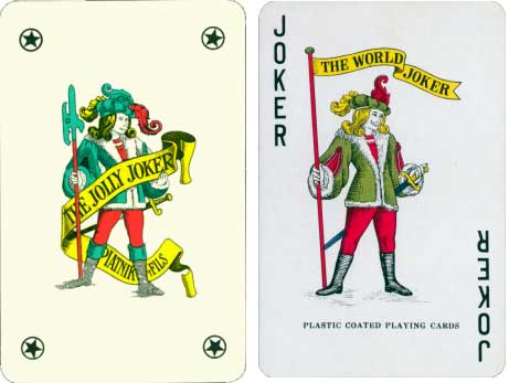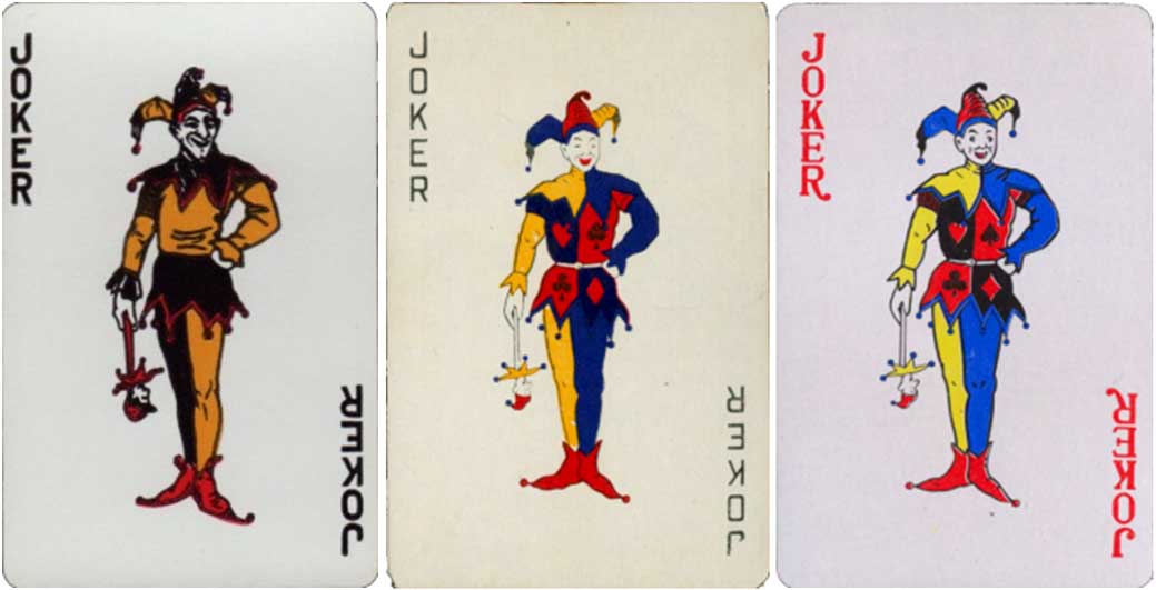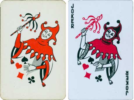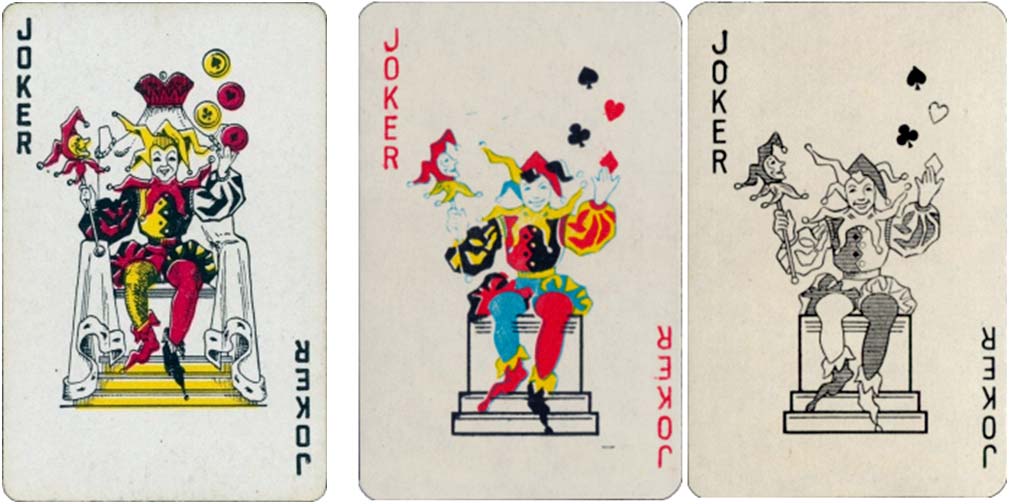 The US playing card company standing jester was copied but incorporating the colouring of the Waddington's standing jester to produce novel variations.