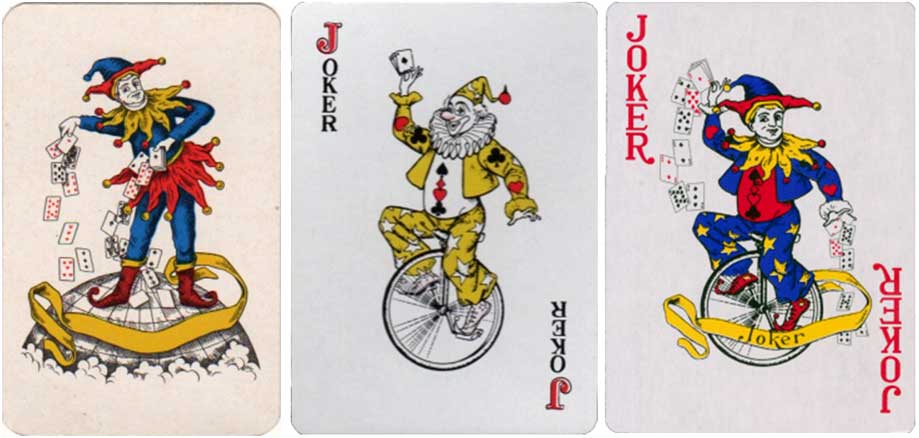 But not as interesting as this design which takes the jester’s face, head, and collar together with the yellow banner from the Cartamundi classic jester, applied to a Chinese original generic unicycling style design.