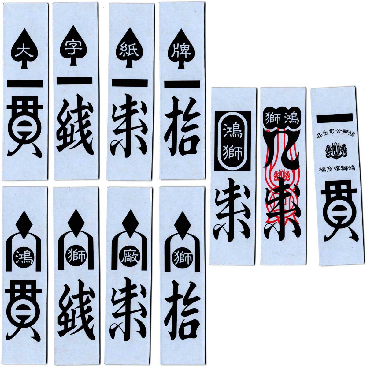 Above: 六虎牌 Six Tiger cards made by Hong Shi 鴻獅, Guangdong province. The inscriptions are the same as before: 大字紙牌 on the 2s of each suit (top row). Rather pleasingly, the order you have to arrange the suits in to reead the inscription is the same in both the Hong Shi and Double Happiness decks. The maker’s name is written on the 8s and 9s of each suit. The ace bears the maker’s stamp (row offset to the right: cards shown are, in order, 8 and 9 of ropes and the ace of Guan). The maker’s name is also added on the 6s of each suit (bottom row). The Three of the cards read 鴻獅廠 "Hong Shi Factory". The fourth card reads 獅, "Lion" again. As for the cards themselves, they are made from a fairly thick cardstock (approximately double the thickness of normal cardstock) and have a pleasing glossy finish. Their backs are plain black in colour. The package is shown below.