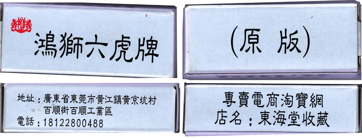 Above: Top left: 鴻獅六虎牌 Hong Shi Six Tiger cards. 2nd image: The company's address and contact number: