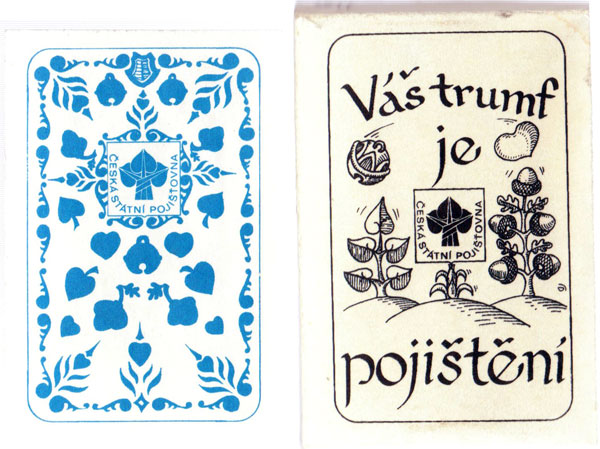 Right: the reverse and the box with the legend “Váš trumf je pojištění. Ceská Státní Pojišťovna” (Your trump card is insurance. Czech Insurance Company) →