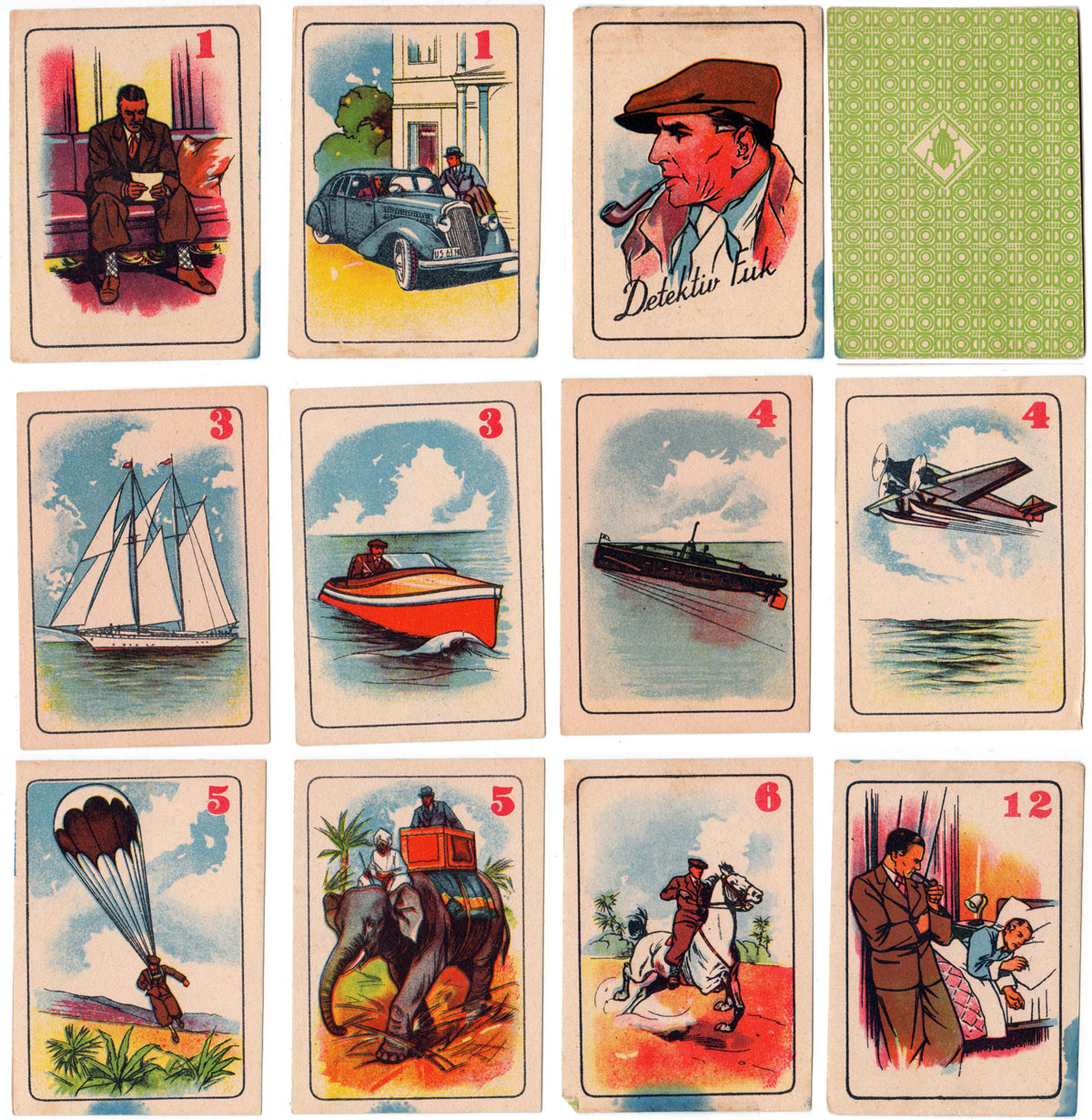 ‘Detektiv Fuk’ card game from the former sovereign state of Czechoslovakia in Central Europe, depicting the detective in various intrepid actions, clearly ‘on the ball’, often smoking his pipe whilst solving mysteries for his multi-millionaire clients.