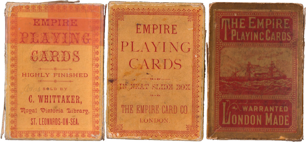 Above: various examples of playing cards and boxes by “The Empire Card Co., London”. It is interesting to note that each box promotes a particular feature, such as "Highly Finished", "In Neat Slide Box" or "Warranted London Made". Images courtesy Ken Lodge.