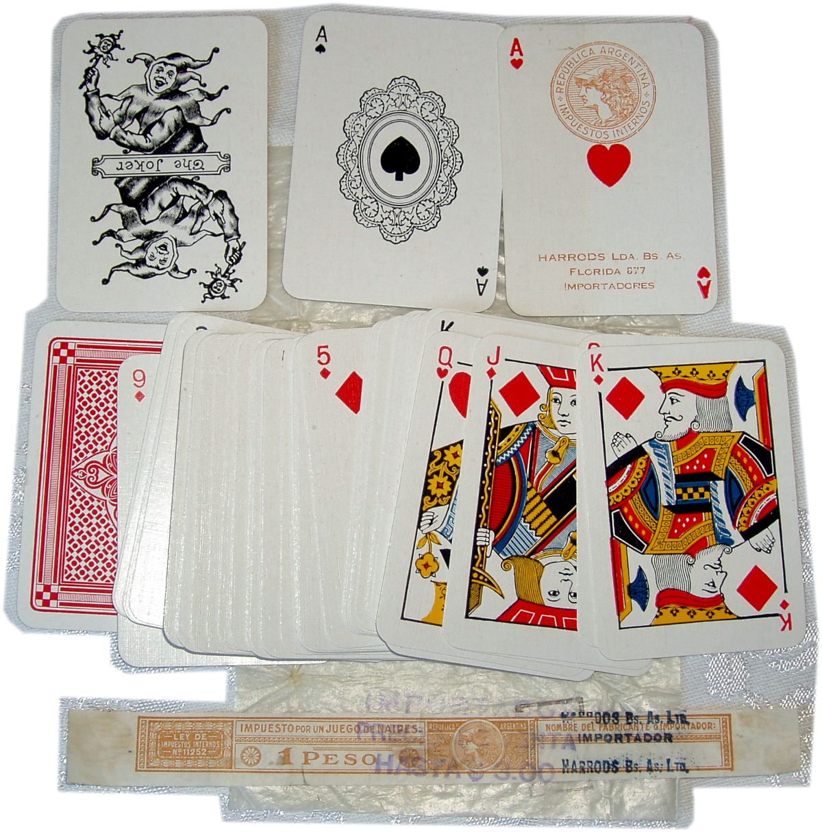 Above: Patience playing cards with doilly ace of spades for Harrods, Buenos Aires Ltd, with Argentinean 'Impuestos Internos' (Mercury) tax stamp on both Aces of Hearts, 1 Peso tax band overprinted "Precio Venta hasta $3.00". Reverse: red or blue & white. C.1920.
