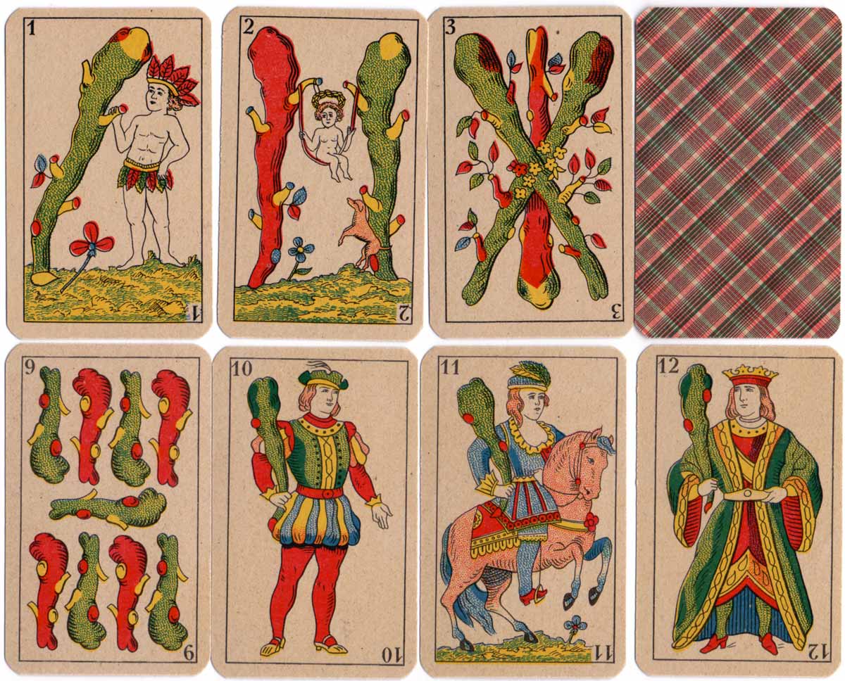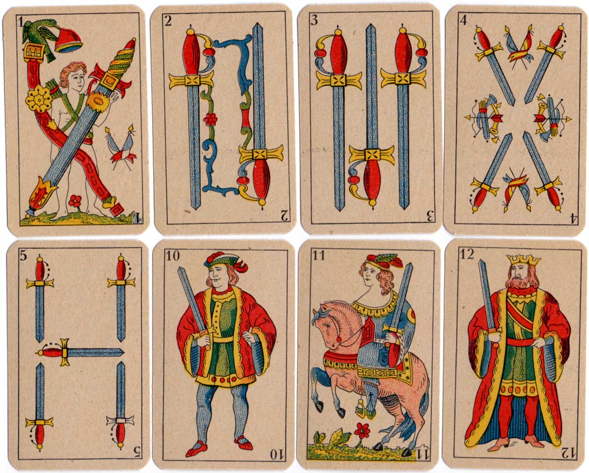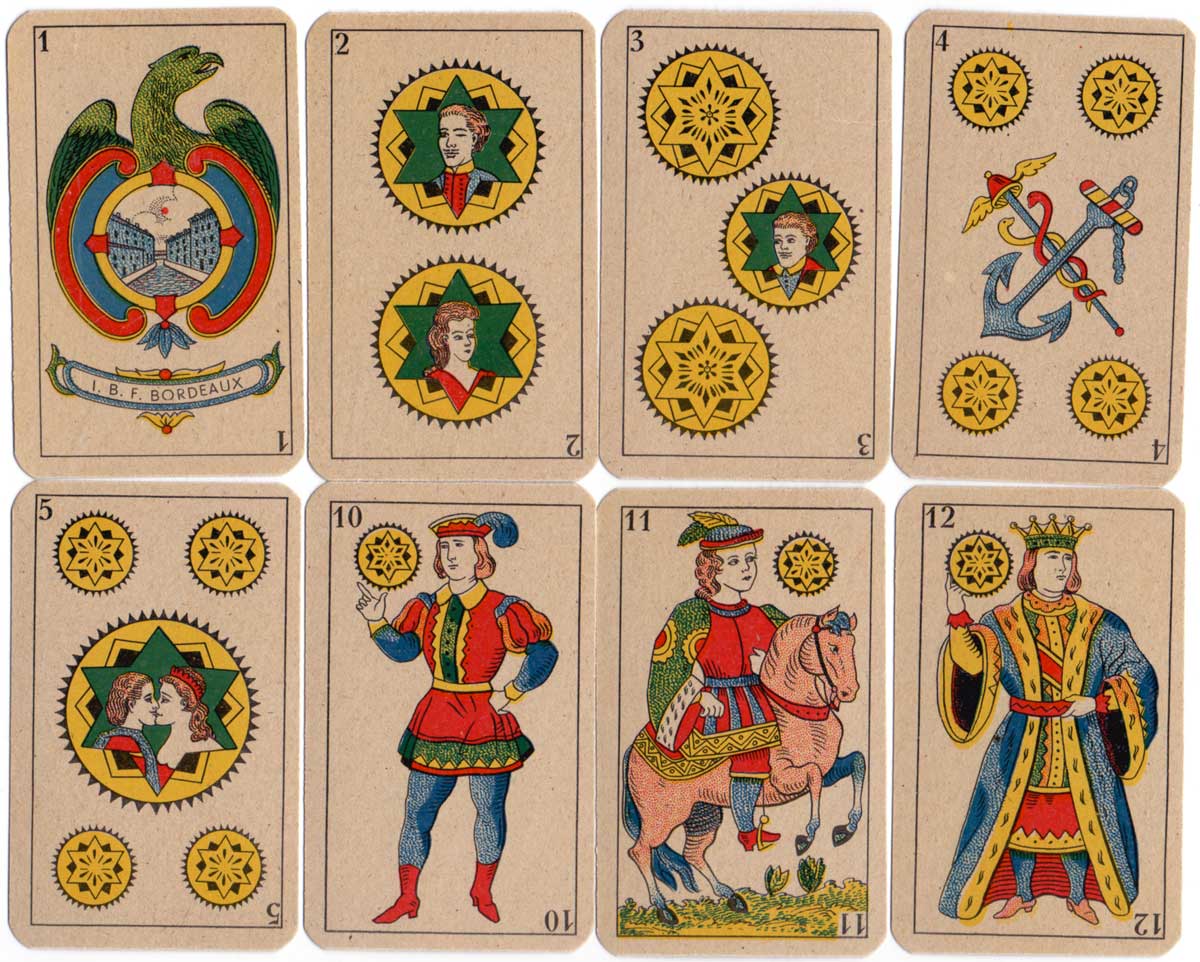 Jeu D’Aluettes manufactured by Boéchat Frères, Bordeaux, c.1950 with archaic Spanish features mixed with the standard Catalan pattern