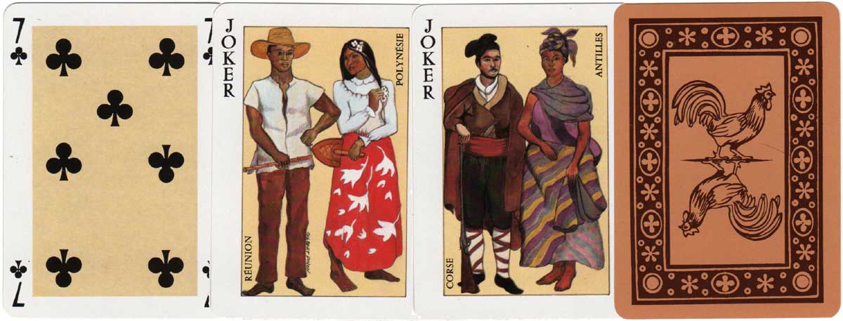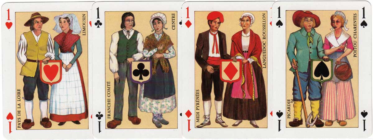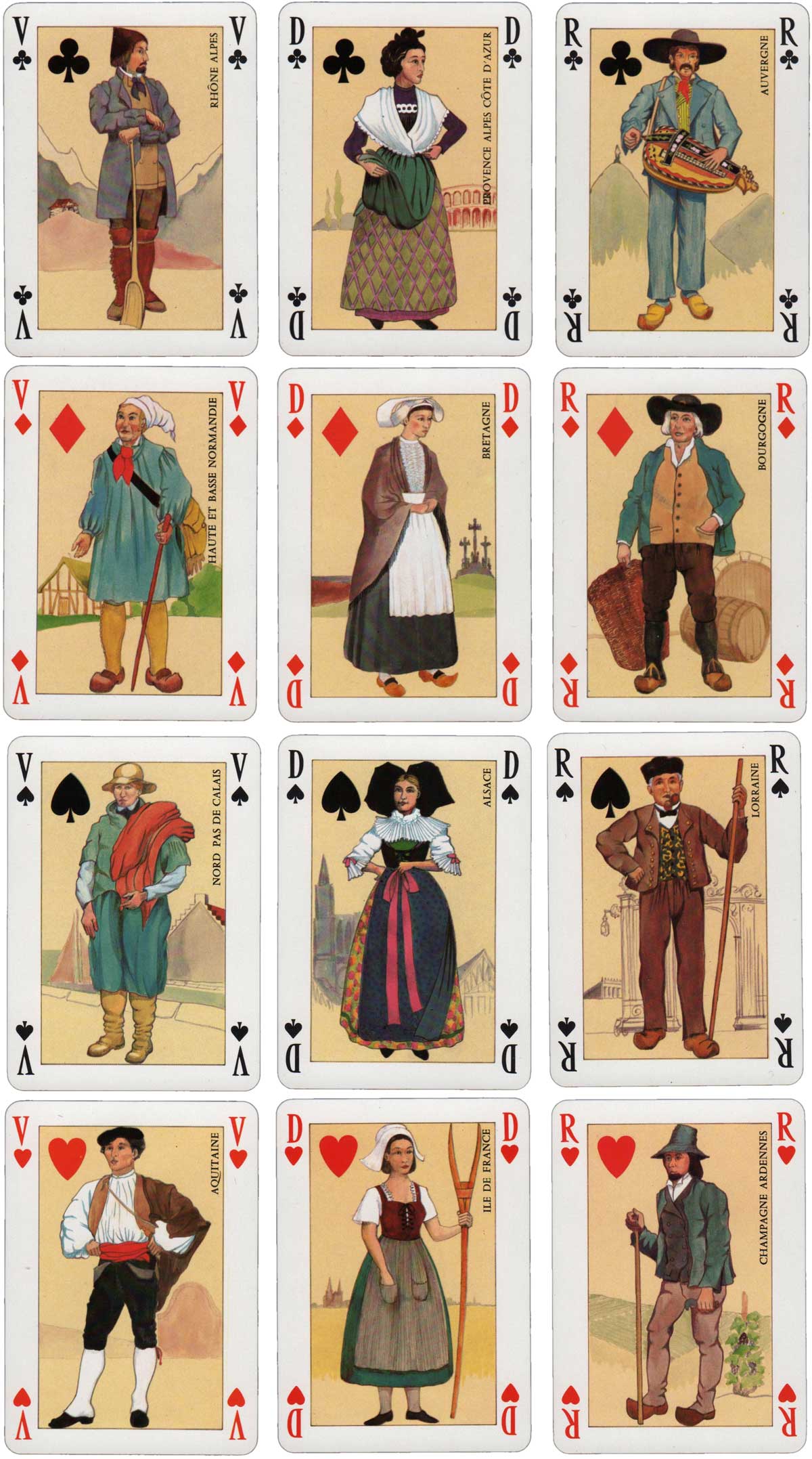 Jeu des Provinces de France published by Éditions Dusserre, printed by Boéchat Frères, 1979. The aces, court cards and jokers feature designs by Gilbert Pinon depicting people in traditional costumes from different provinces. See the Box►