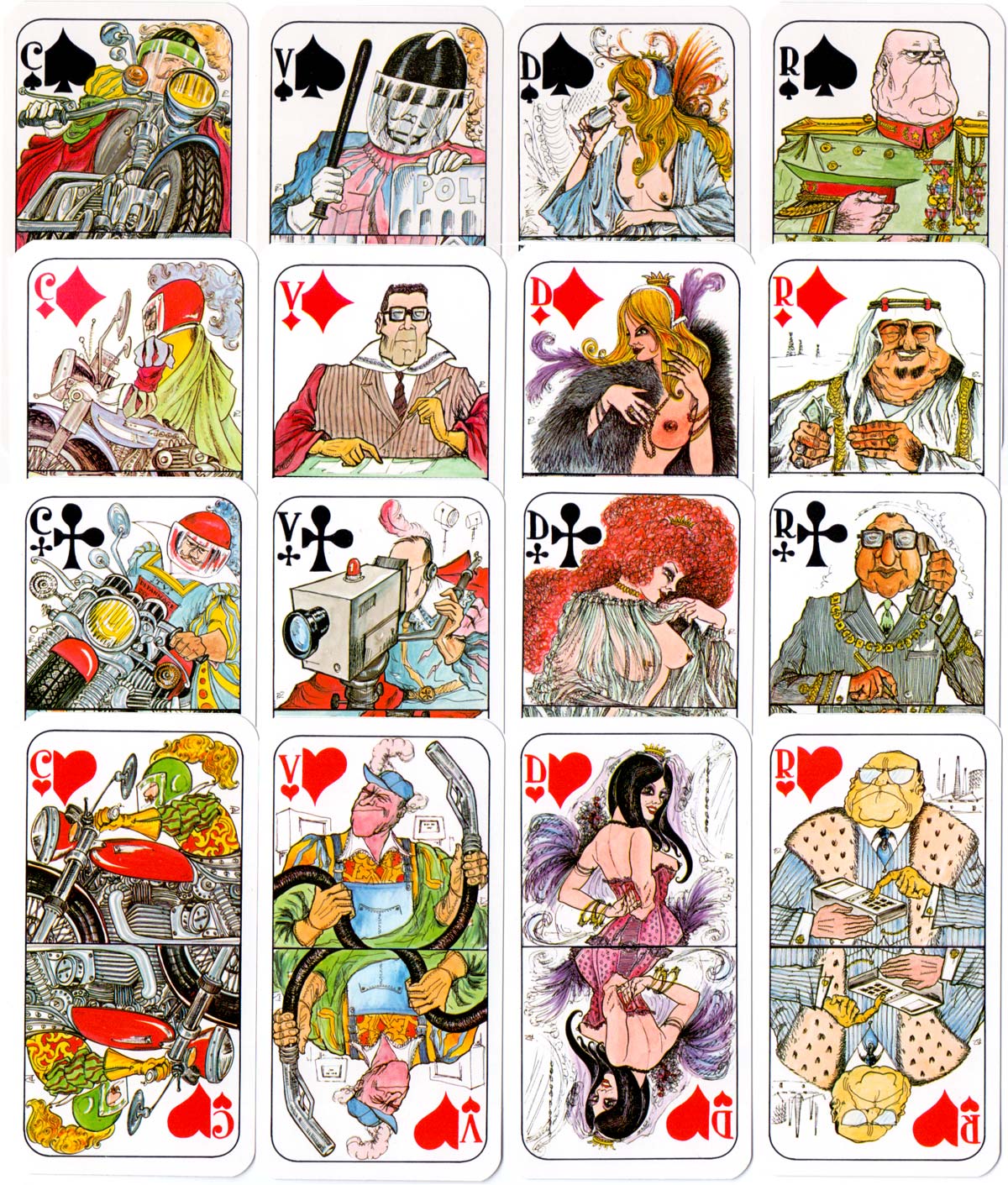 The court cards and also double ended and illustrated in colour, with the two ends a mirror image of each other. Giuseppe Zaccaria, also known as Pino Zac, studied architecture in Rome, before going into illustration.