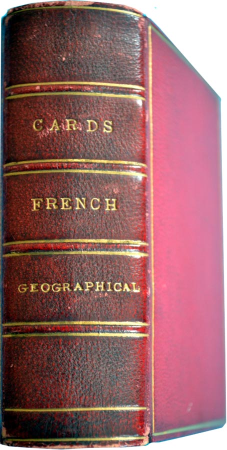 Above: “Jeu de Géographie” educational playing cards etched by Stefano Della Bella (1610-1664) and published by Henry le Gras, c.1644. The title card bears a planisphere. The cards are unsuited but with indices 1 to 10, the court cards are not indexed. All cards are hand coloured on pasteboard. Total 52 cards + title card. The cards in this set have had borders trimmed and were mounted and bound in Red Morocco leather.