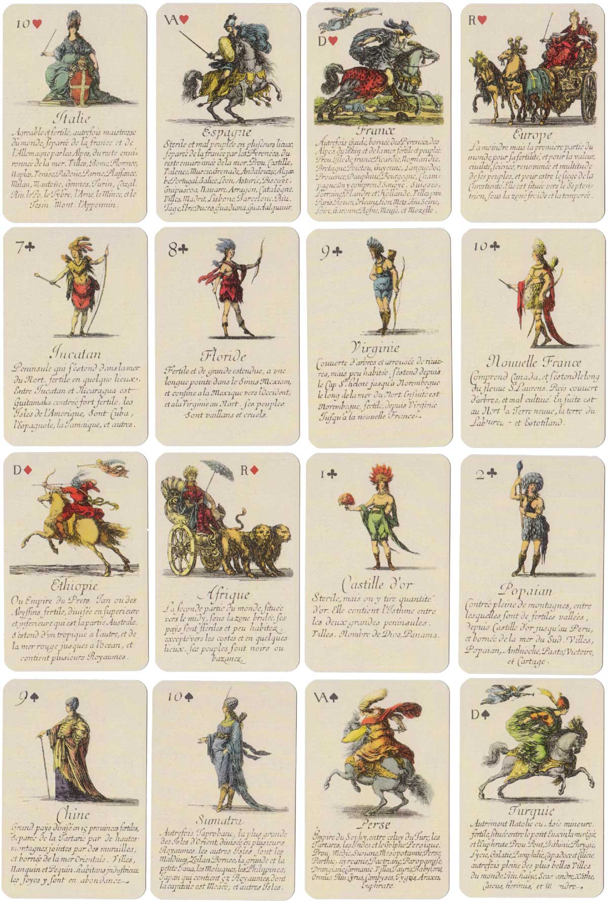 Extremely scarce “Jeu de Géographie” playing cards, one of several educational sets etched by Stefano Della Bella (1610-1664) and published by Henry le Gras, c.1644. The cards bear personifications of countries or continents, with allegorical figures. In this set the suit symbols have not been included, but the intention was that the four suits represent the four known continents: hearts are Europe; diamomds are Africa; clubs are America, and spades are Asia.