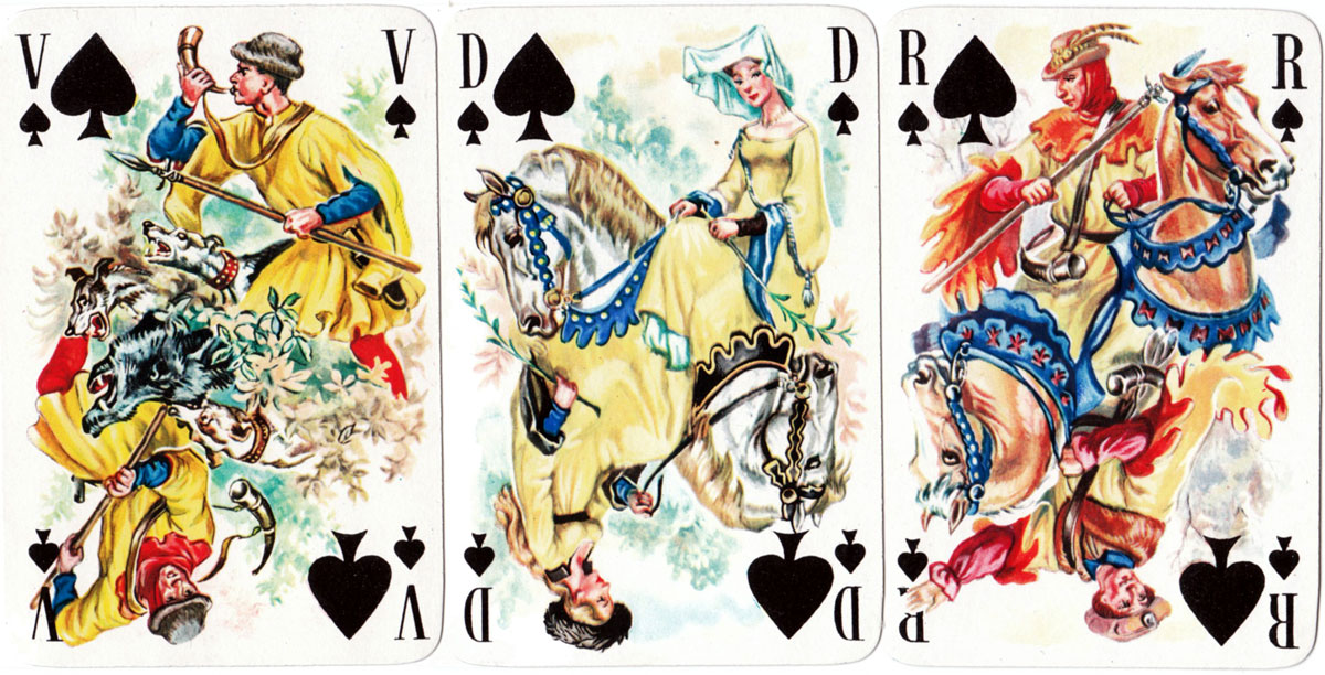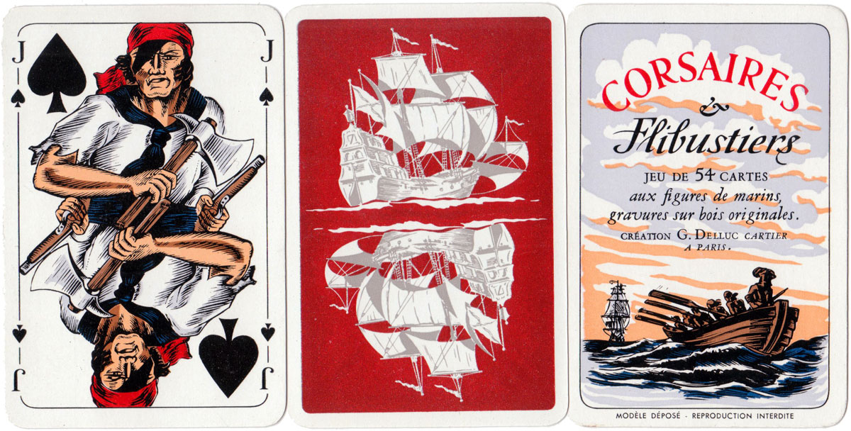 After World War II the floodgates for imaginative card-making opened (once again). Éditions Philibert published an outstanding luxury series of artistic and sometimes risqué playing cards in Paris from 1954 to 1960, including: Les Mousquetaires, St Hubert's Bridge, Corsaires et Flibustiers, Proverbes, Pierres Precieuses, Paris Scenes, Sirenes, Veronique, Déesses, Can-Can, Le Florentin and Mémoires de Casanova. Cards were produced to a high standard of quality with gilded edges. Many of the decks involve photographs of life models or scenic views; others depict paintings with different scenes at each end.