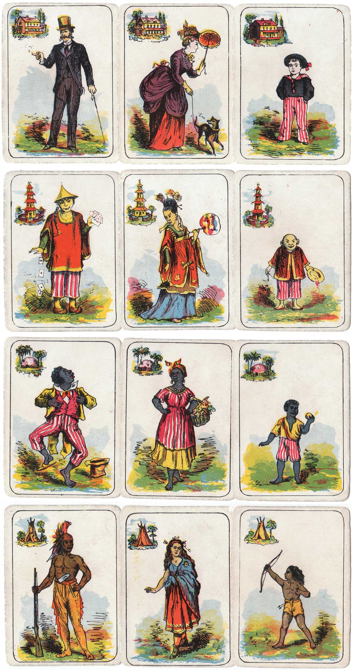 The “Game of Nations” is played with a 52-card deck divided into four suits representing Europe, Asia, Africa and America. These are in fact four continents rather than nations, inkeeping with other ‘Four Continent’ or Empire packs published around this time. Each ‘nation’ has 13 cards, with designs appropriate to the geographical region featured in that suit, running 2 → 10, Child, Woman, Man and Map (highest card). The court cards depict caricatures of people wearing traditional costumes from each of the four ‘nations’ in somewhat stereotyped style by today’s standards. See the Rules: English / French►