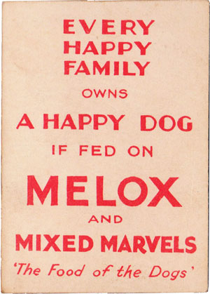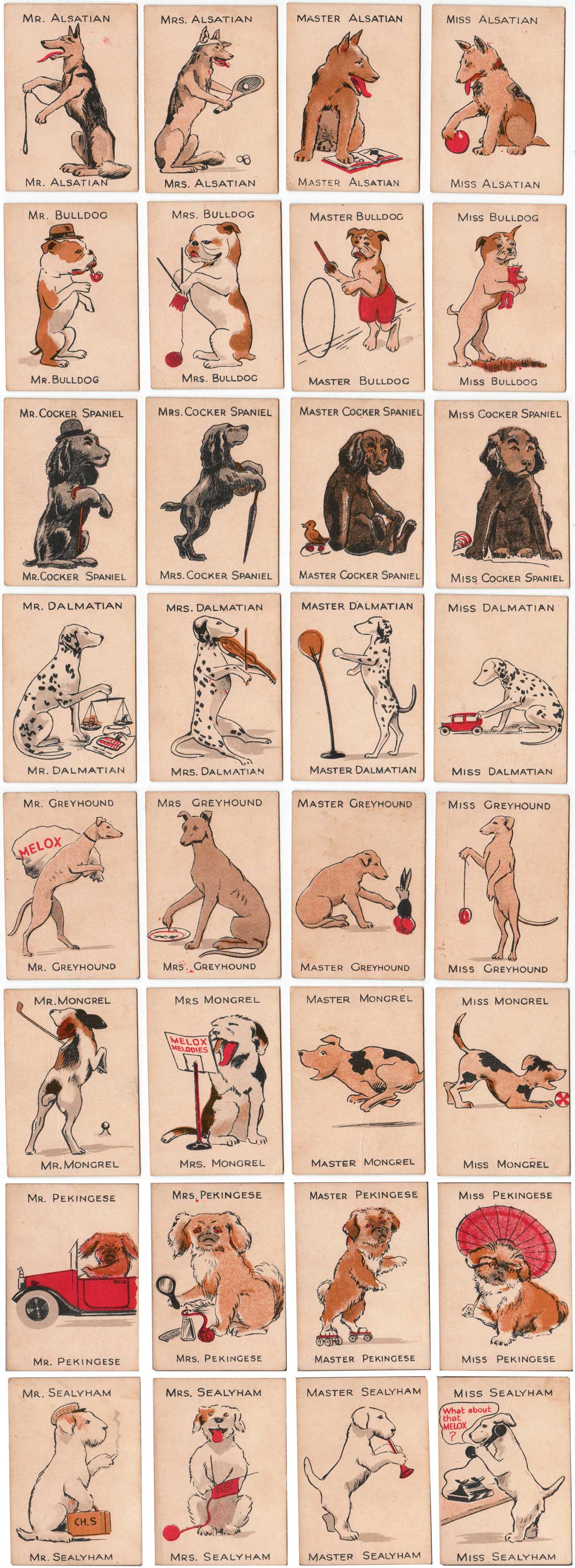 The “Game of Happy Melox Families” children's cards was published by W. G. Clarke & Son of Thomas Street, London, in 1929 to promote Melox dog food. The families are represented by seven breeds of dog, shown engaged in leisure activities such as playing sports, answering the telephone, reading or playing with toys.