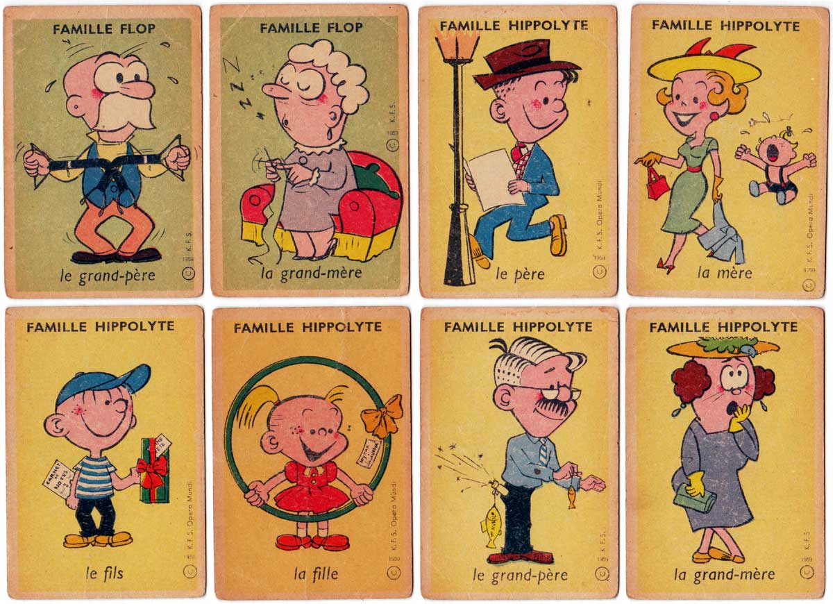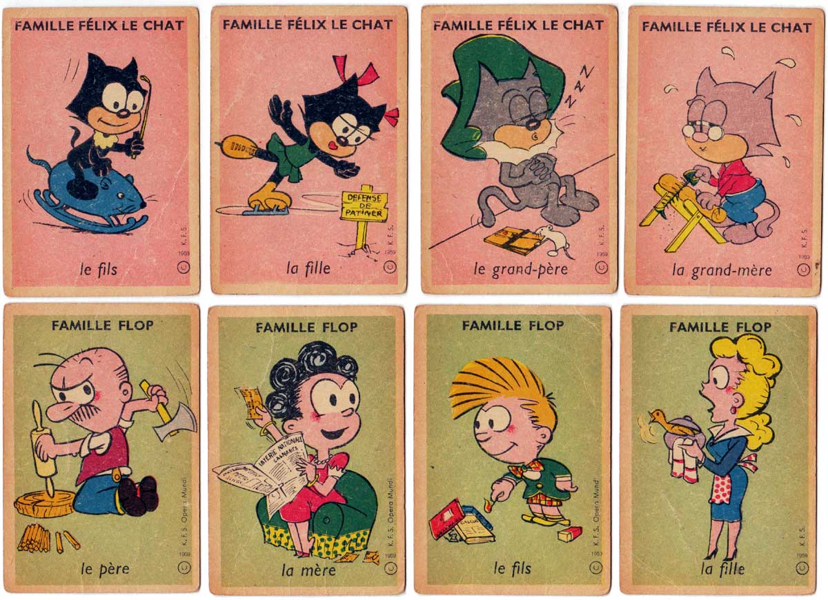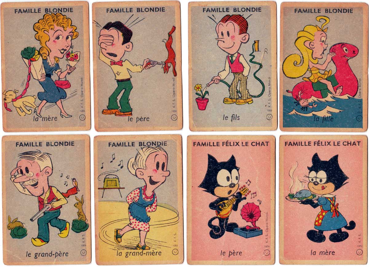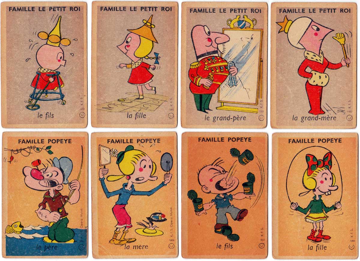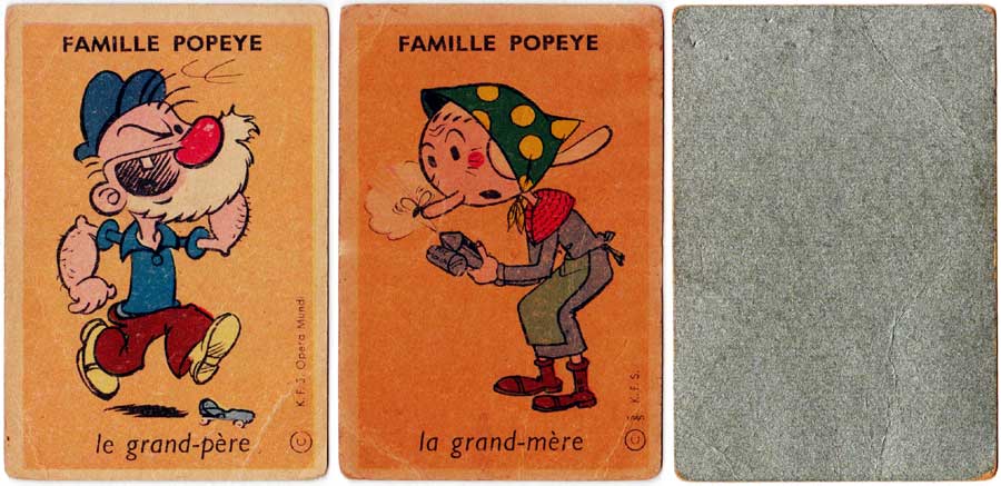 Jeu des Sept Familles © K.F.S. Opera Mundi c.1960. Opera Mundi had been founded in 1928 by Paul Winkler selling articles to newspapers. In 1930 he became the European representative for KFS (King Features Syndicate), who distributed a number of comic book magazines and toys featuring the characters which appear in this card game. Opera Mundi was the KFS distributor in most European countries between 1950 and 1975.