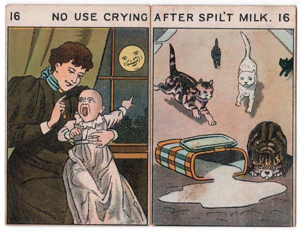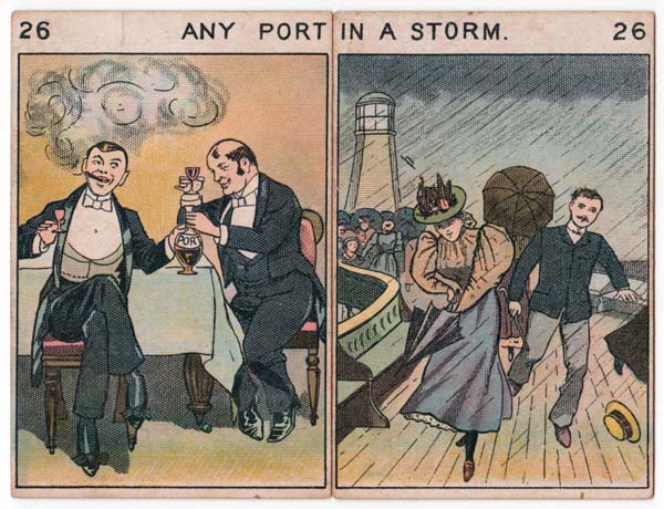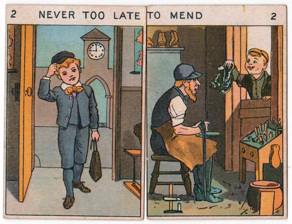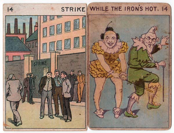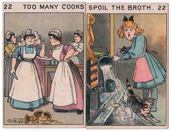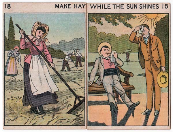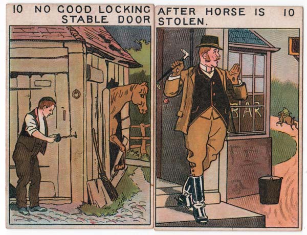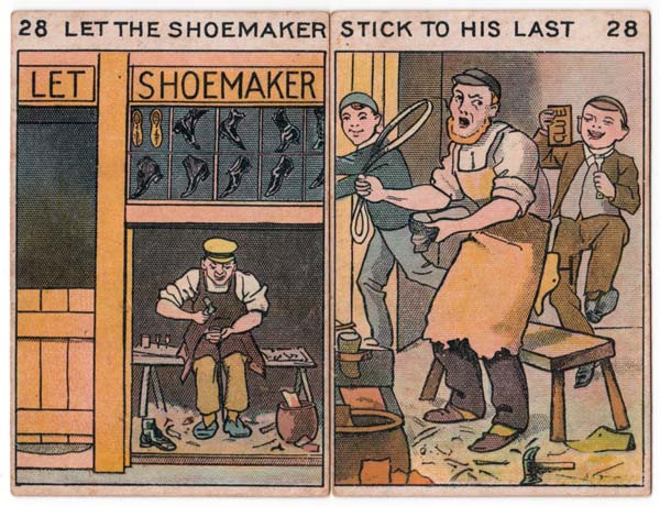 Many of these proverbial sayings are still used in many households on a regular basis and others are relics of a time and era which has taken its place in the past. On the box (shown left) the designs are described as "amusing, humorous & artistic". Some of the illustrations show the social inequalities with prosperity for some and poverty and misery for others. It was a time of great inventiveness but also a time of great upheaval. Advice and quotes were always at hand, whether one belonged in the upper or lower classes.
