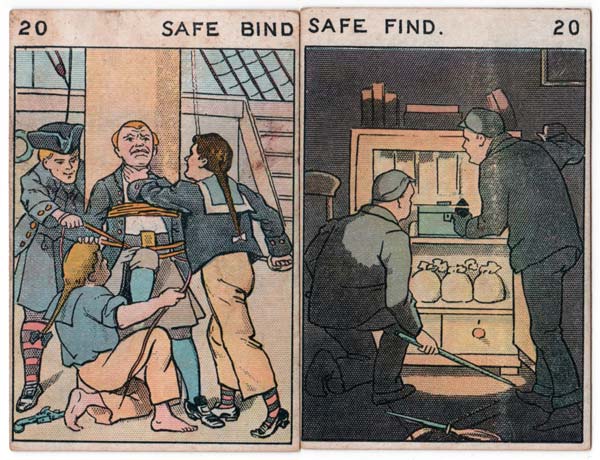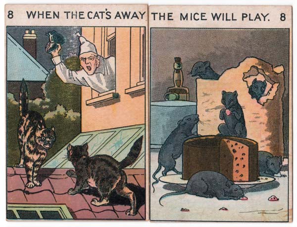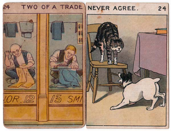 Above: the pack has 56 cards, the backs of the cards are pale yellow. The game is for 5 or more players and consists of 28 pairs of cards illustrating popular Victorian proverbs which were seen as words of wisdom or had a moralising innuendo. Play involves asking other players for a card and laying down completed proverbs; the game is won by the player who has completed the most proverbs. In the event of a player not knowing the words to complete the proverb, he may ask for the number.