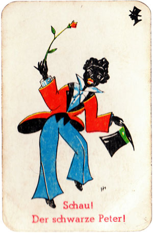 The pack contans 12 matching pairs of cards including elves, pixies, clowns, etc., plus one “Schwarze Peter”. The main focus of the game is towards the last card which in this case is a comic black character holding a rose... maybe he knows if you've been good or bad! “Schwarzer Peter” was re-titled in other countries as Old Maid in England, Zwarte Piet (Netherlands), Svarte Petter (Sweden) and Pekka-Peli (Finland).