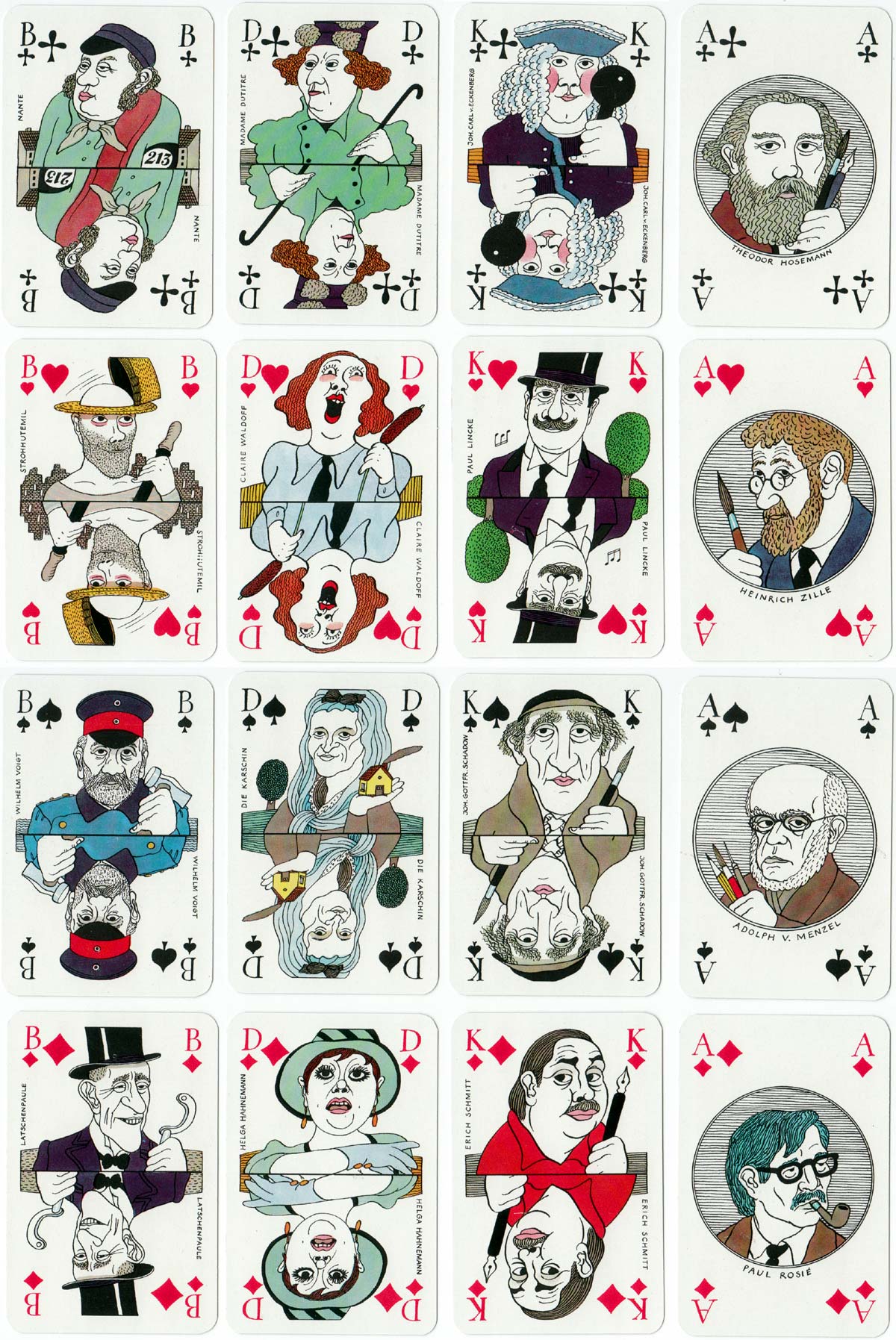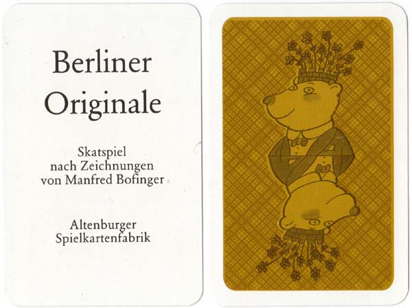 Above: “Berliner Originale” skat deck designed by Manfred Bofinger (1941-2006), printed by VEB Altenburger Spielkartenfabrik, 1986. 32 cards + extra card. 52 card editions were also published containing a number of different jokers.