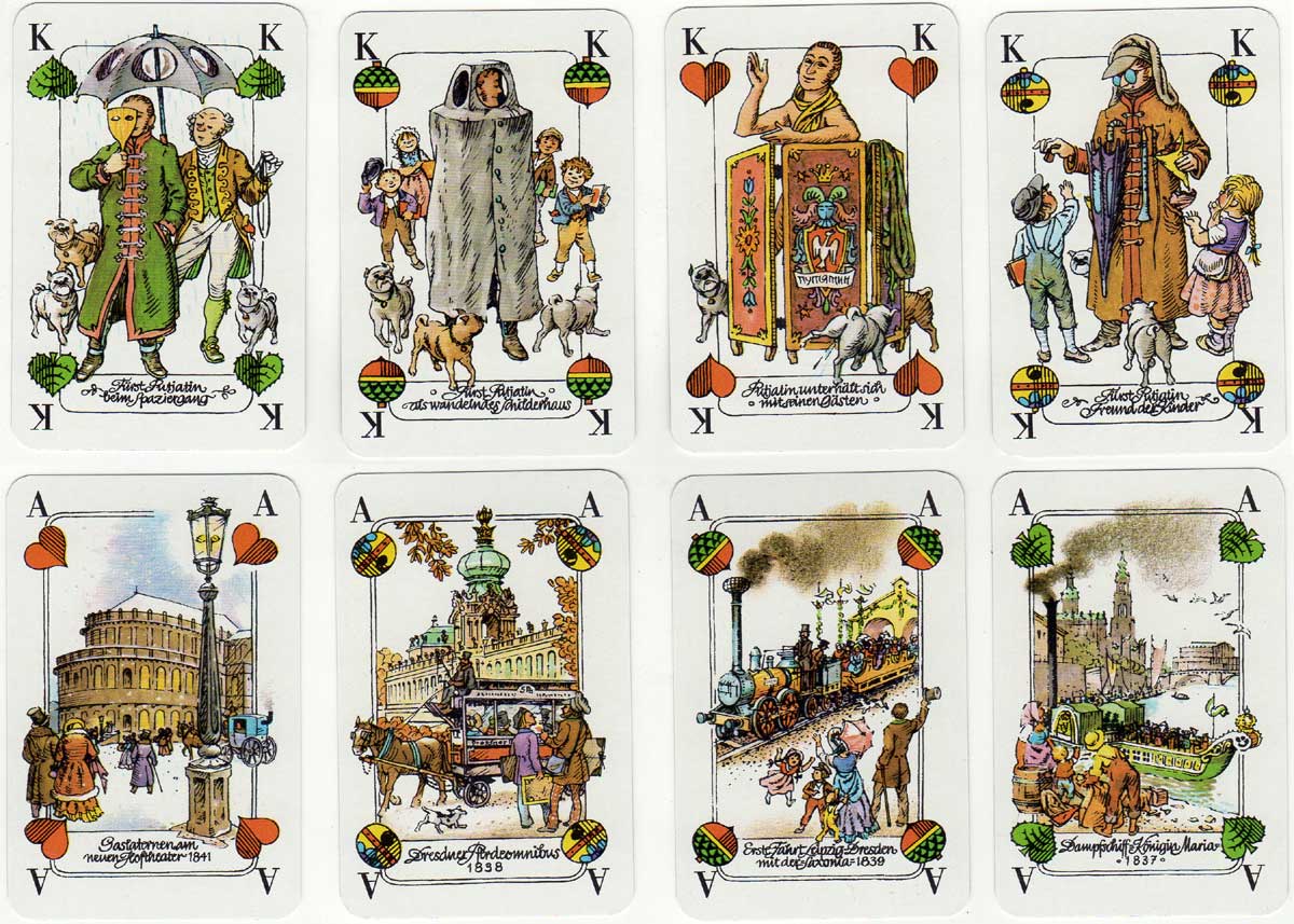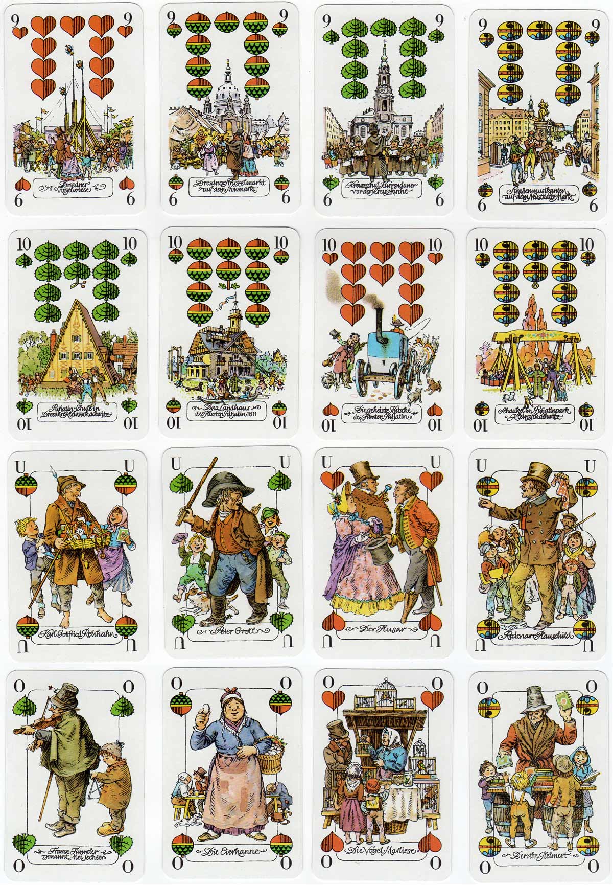 German ‘Doppelkopf’ pack (2 decks of 24 cards each) with historical motifs and characters from Dresden on all cards, designed by Günter Schmitz, manufactured by VEB Spielkartenfabrik Altenburg, 1989.