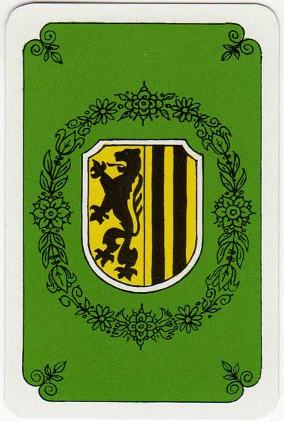 Above: ‘Dresdner Doppelkopf’ deck with scenes of Dresden designed by Günter Schmitz, manufactured by VEB Spielkartenfabrik Altenburg, 1989. 48 cards (2 x 24 cards, from 9 to ace). The reverse shows the Dresden coat of arms. Images courtesy Matt Probert.
