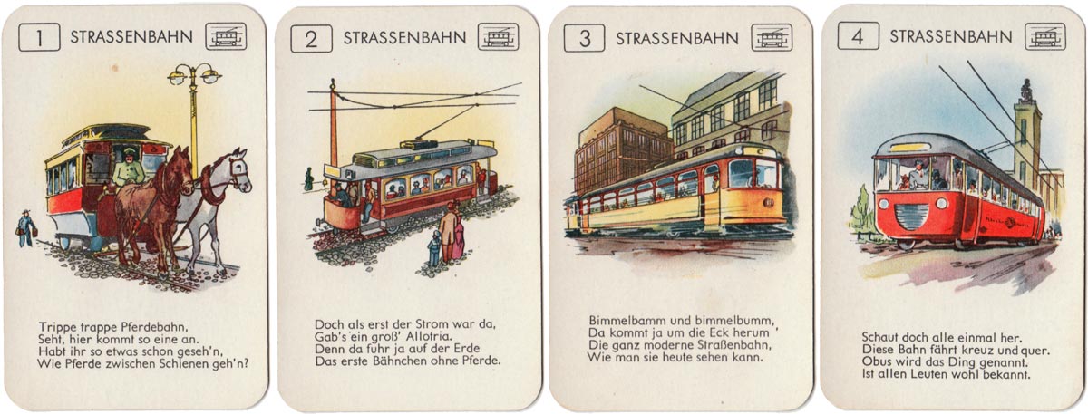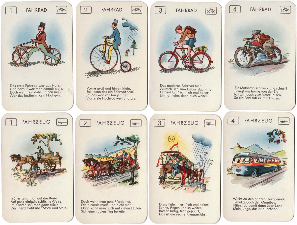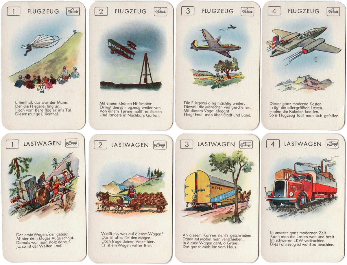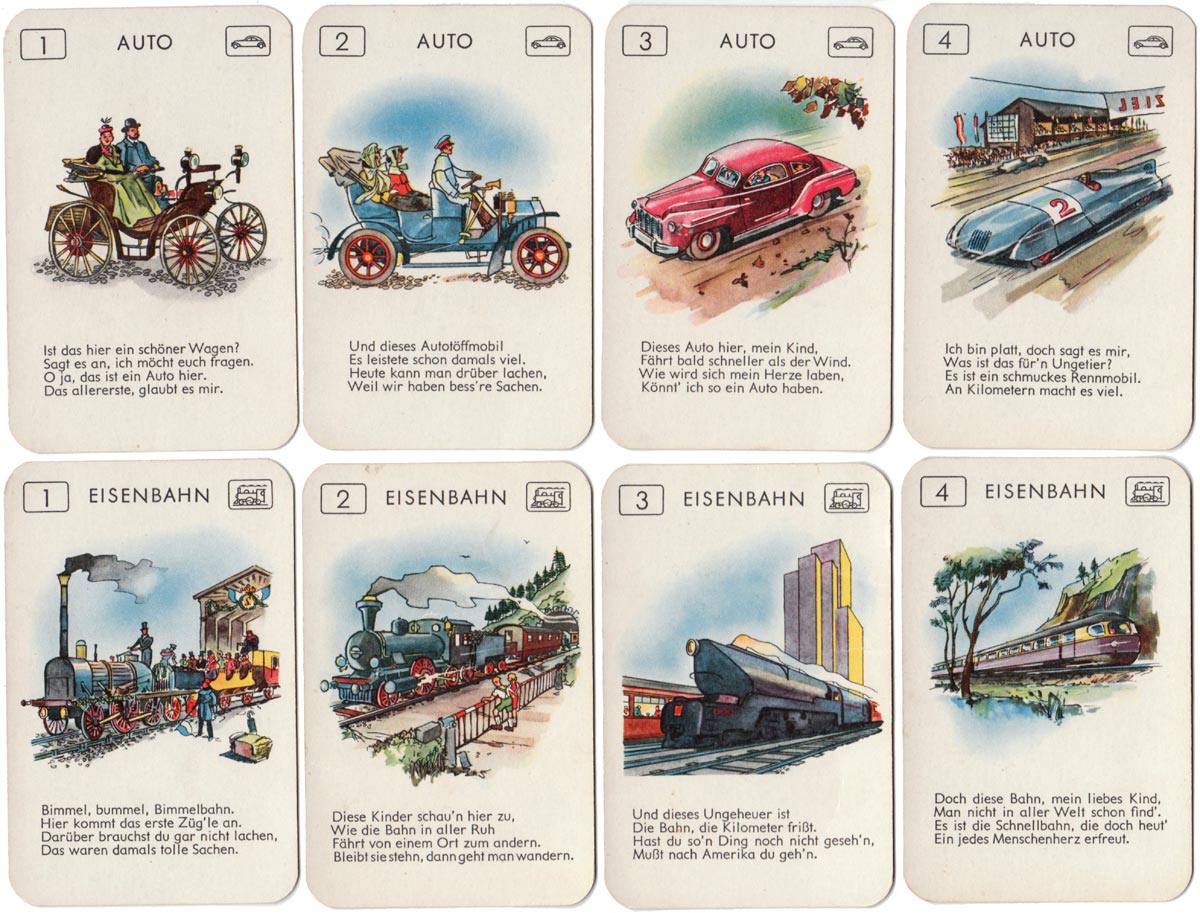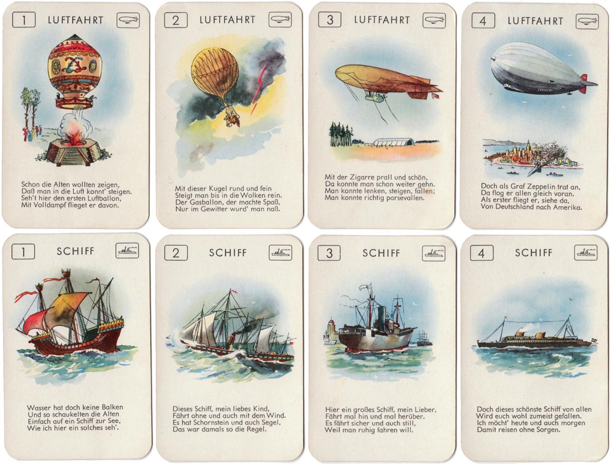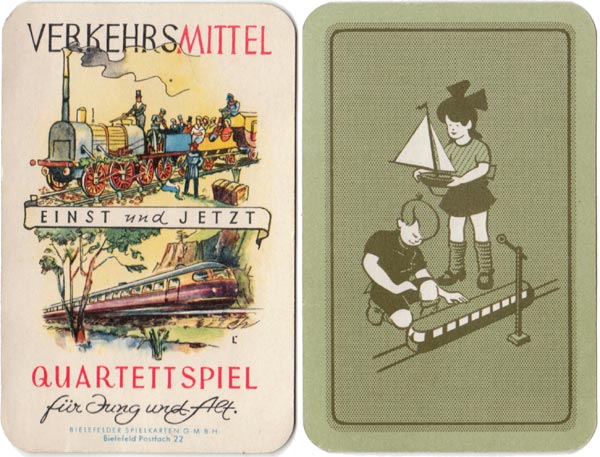 Above: Verkehrsmittel Einst und Jetzt quartet game, Bielefelder Spielkarten Fabrik GmbH, 1949 (reprinted 1956?). 36 cards + rules + title card.