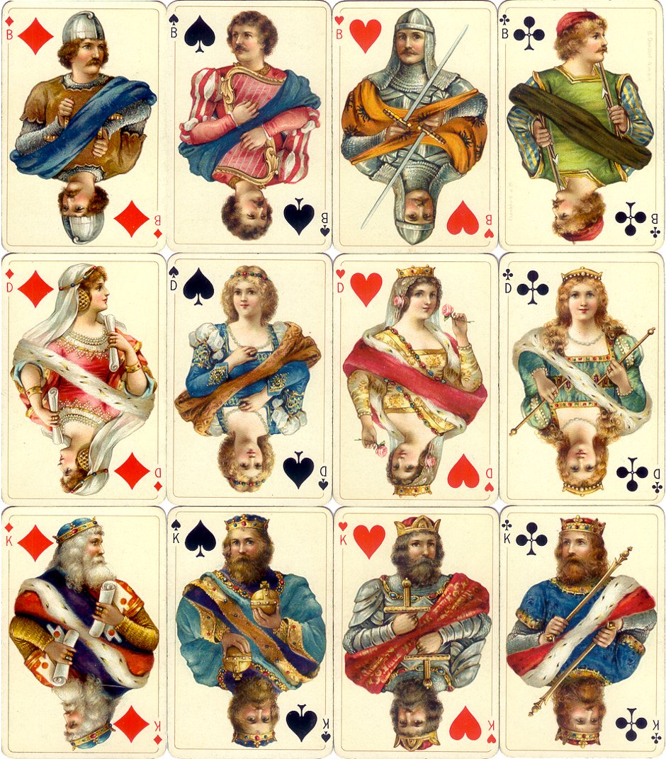 Another of Dondorf's masterpieces of chromolithography, the detailed artwork on these cards has multiple tints and highlights giving the figures a brilliant, glossy character. The fabric of the clothes looks like velvet, the metal parts of the crown, sceptre and armour seem highly polished. The young men appear tender, young and handsome whilst the Kings have shining hair and beards. All the eyes are shining. Later editions of this deck are no longer printed so carefully, the colours blend into each other, their brilliance greatly reduced.